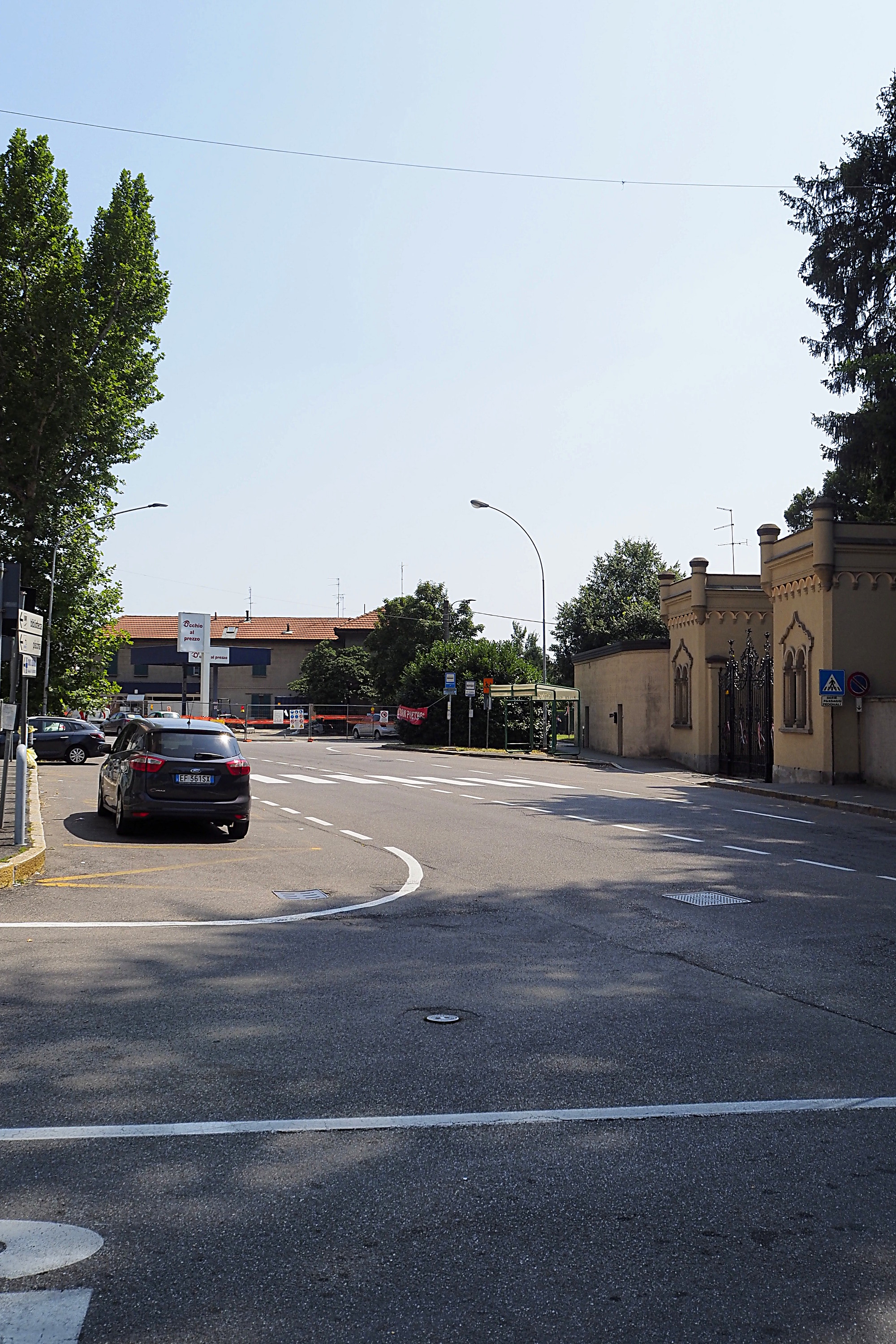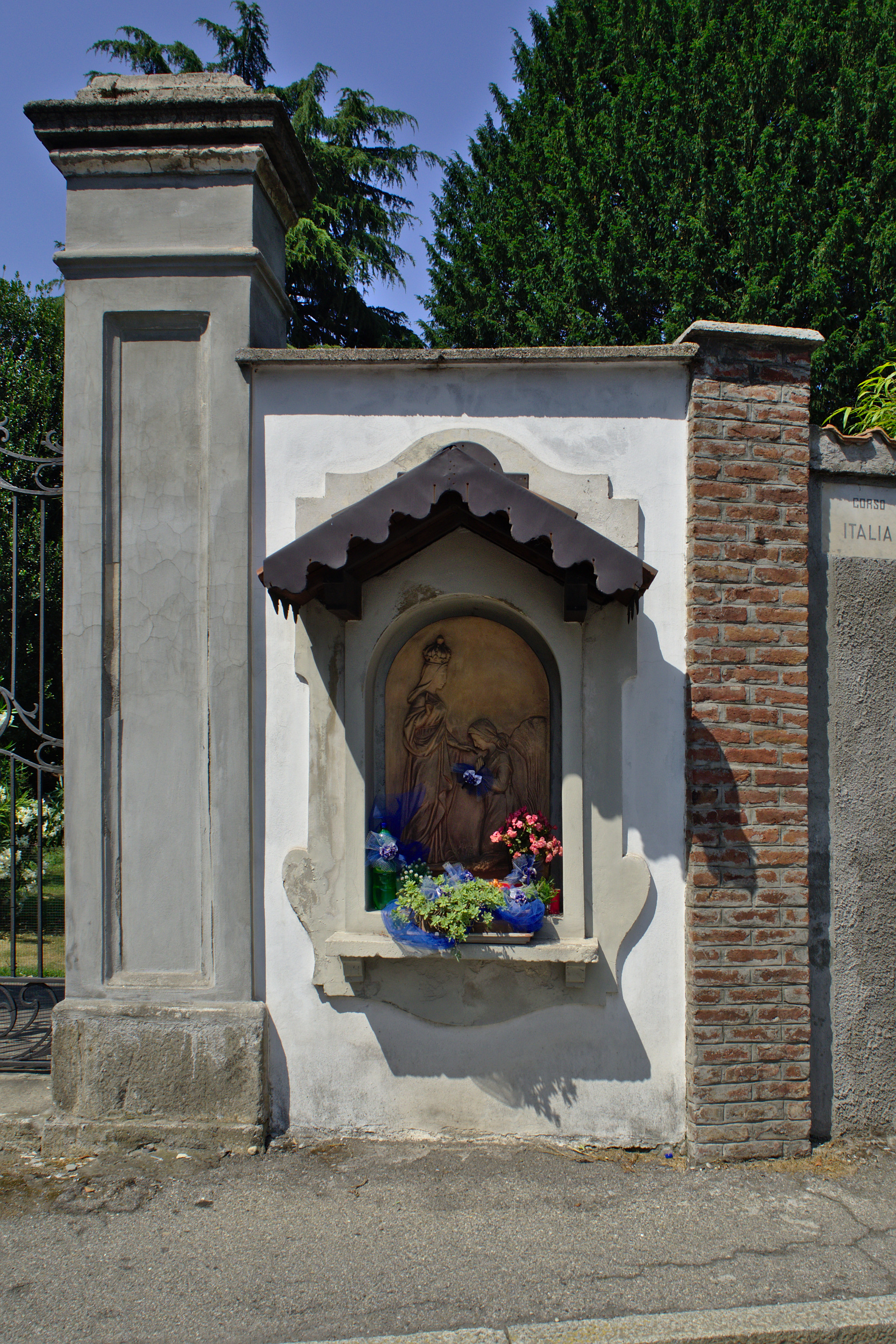 L'edicola presenta un bassorilievo che rappresenta una contadina inginocchiata davanti alla Madonna Incoronata. L'iconografia sembra corrispondere alla Madonna di Caravaggio