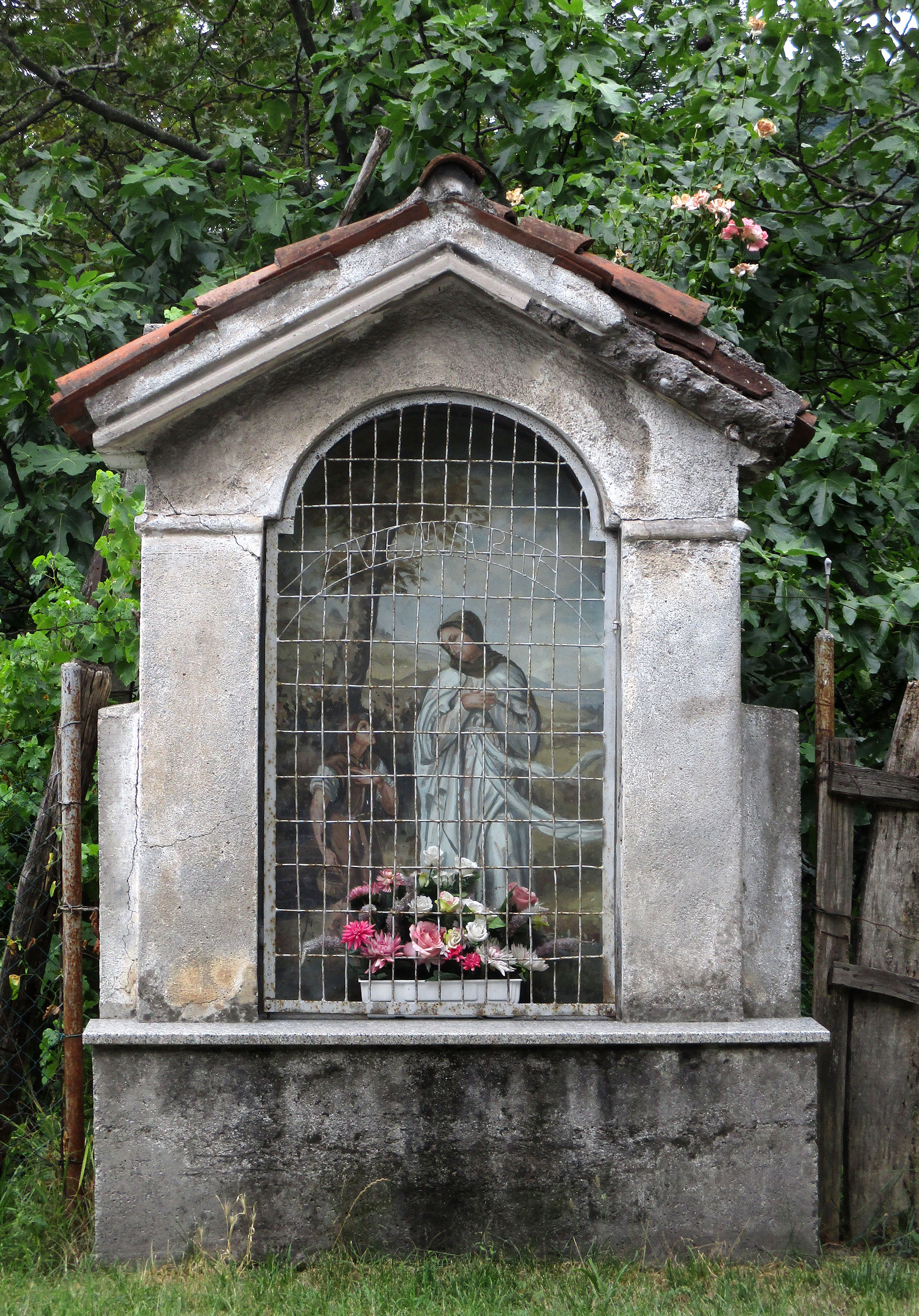 L’affresco all’interno dell’edicola racconta della apparizione della Vergine a Filippo Viotti, un pastore sordomuto che era per i boschi in cerca di more. Accanto alla Madonna in candide vesti, il giovane in preghiera ha in mano il cestino. Con l’apparizione, poté riacquistare l’udito e la parola. Il miracolo avvenne nel 1532, nei boschi attorno a Paitone, un centro nella bassa Val Sabbia, dove due anni dopo fu eretto un santuario, tuttora esistente. Sopra l’altare maggiore, un dipinto del pittore bresciano Alessandro Bonvicino detto il Moretto (1498-1554), riproduce realisticamente la scena. Secondo la tradizione, il Moretto si ispirò direttamente ai racconti del Viotti. E’ considerata una delle principali opere d’arte custodite in Val Sabbia. L’affresco dell’edicola di Barghe ne è una copia.