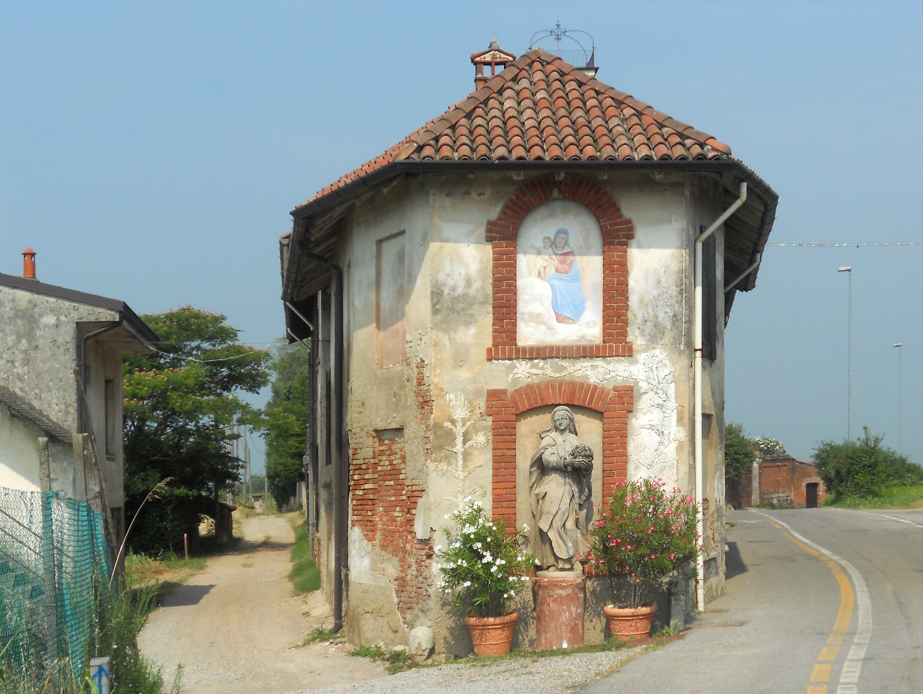 Lungo Strada Consorziale detta della Moccia, sulle colline che dominano San Colombano al Lambro, si trova questa Edicola che faveva parte del fronte di un antico insediamento rurale del XVIII secolo detto appunto Cascina della Madonna dei monti. Gli scatti sono stati realizzati in due momenti diversi, così da sancire la veduta dell'Edicola nel paesaggio fronte a lei attraverso la proiezzione dell'ombra in un'ora diversa dalla prima.