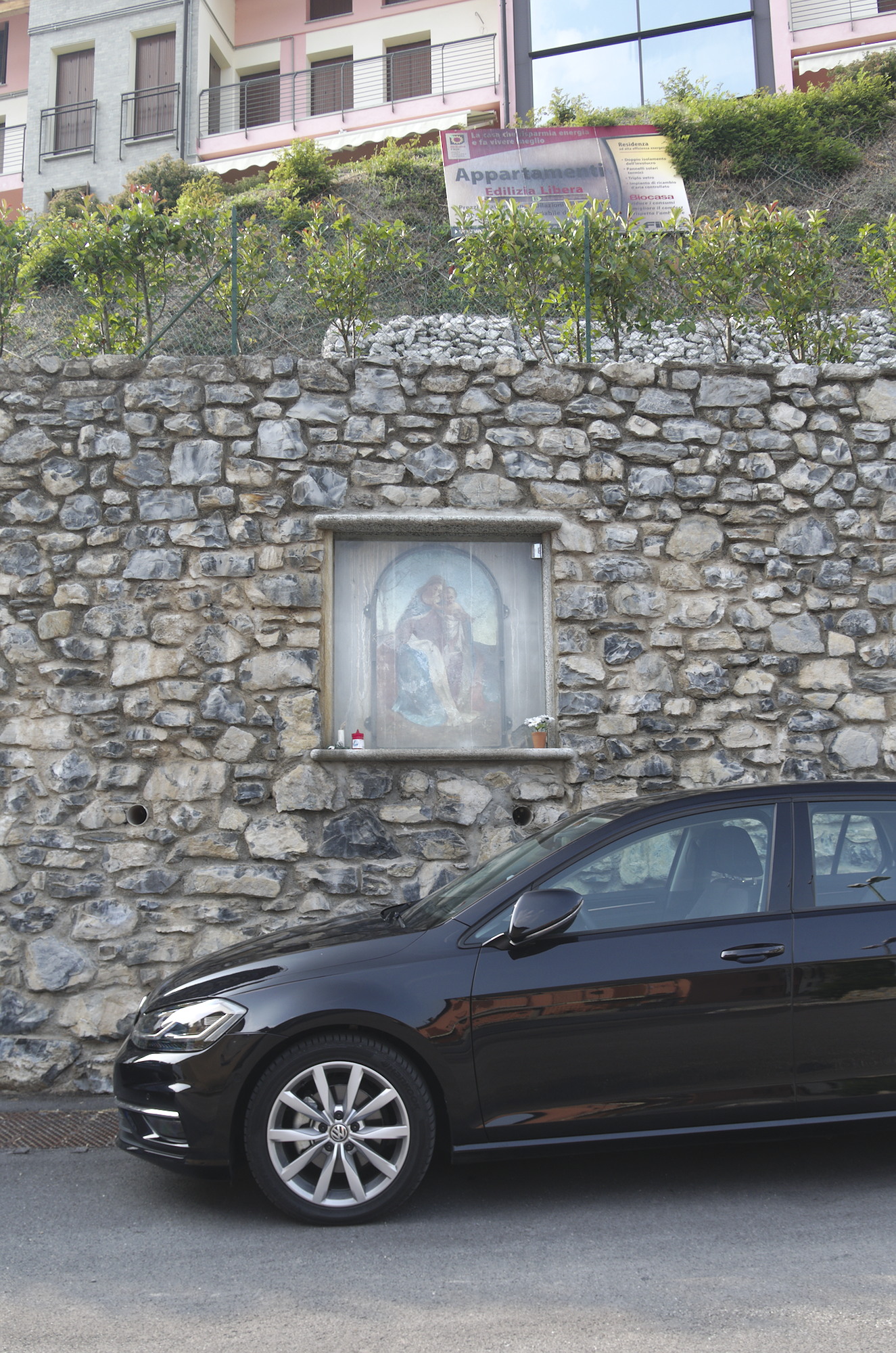Nicchia con affresco, riportato su cornice metallica verosimilmente dopo il rifacimento del muro che lo ospita, raffigurante la Madonna col Bambino - Cesana Brianza, via dell’alpetto incrocio via Giovanni Paolo II