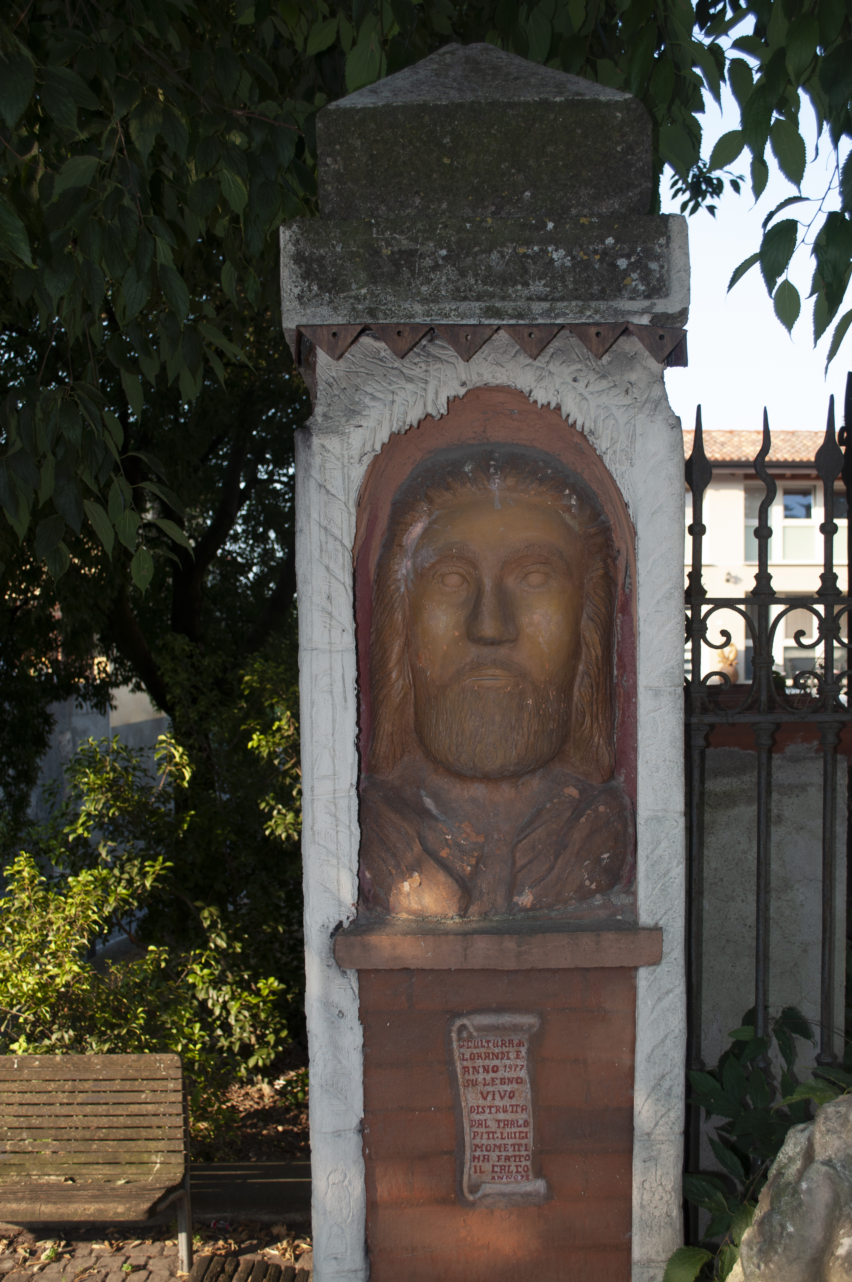 Sotto l'edicola c'è una scritta che dice "Scultura di Lorandi F. anno 1977 su legno vivo distrutta dal tarlo.