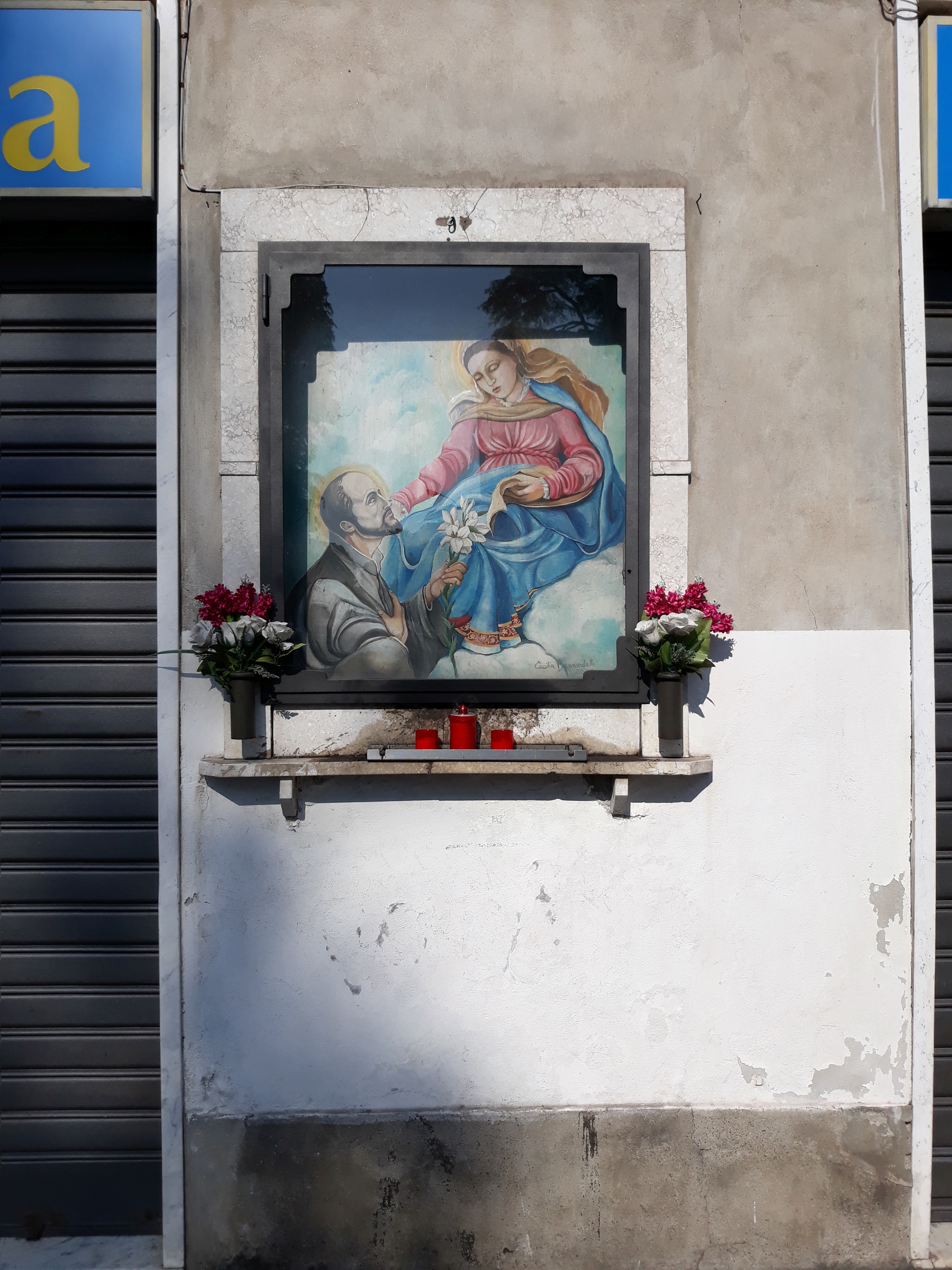 L'edicola sacra ritrae Sant'Antonio Maria Zaccaria, fondatore della congregazione dei Barnabiti,in adorazione alla Madonna.