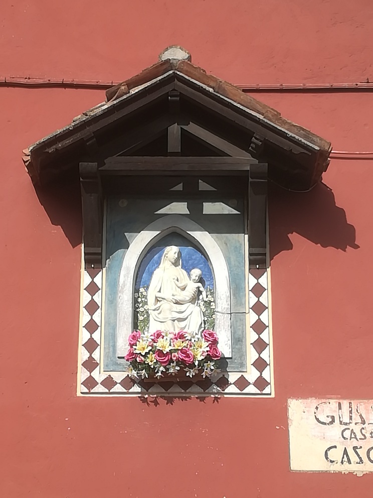 In una nicchia è posta una Madonna intronizzata con bambino, in terracotta invetriata.