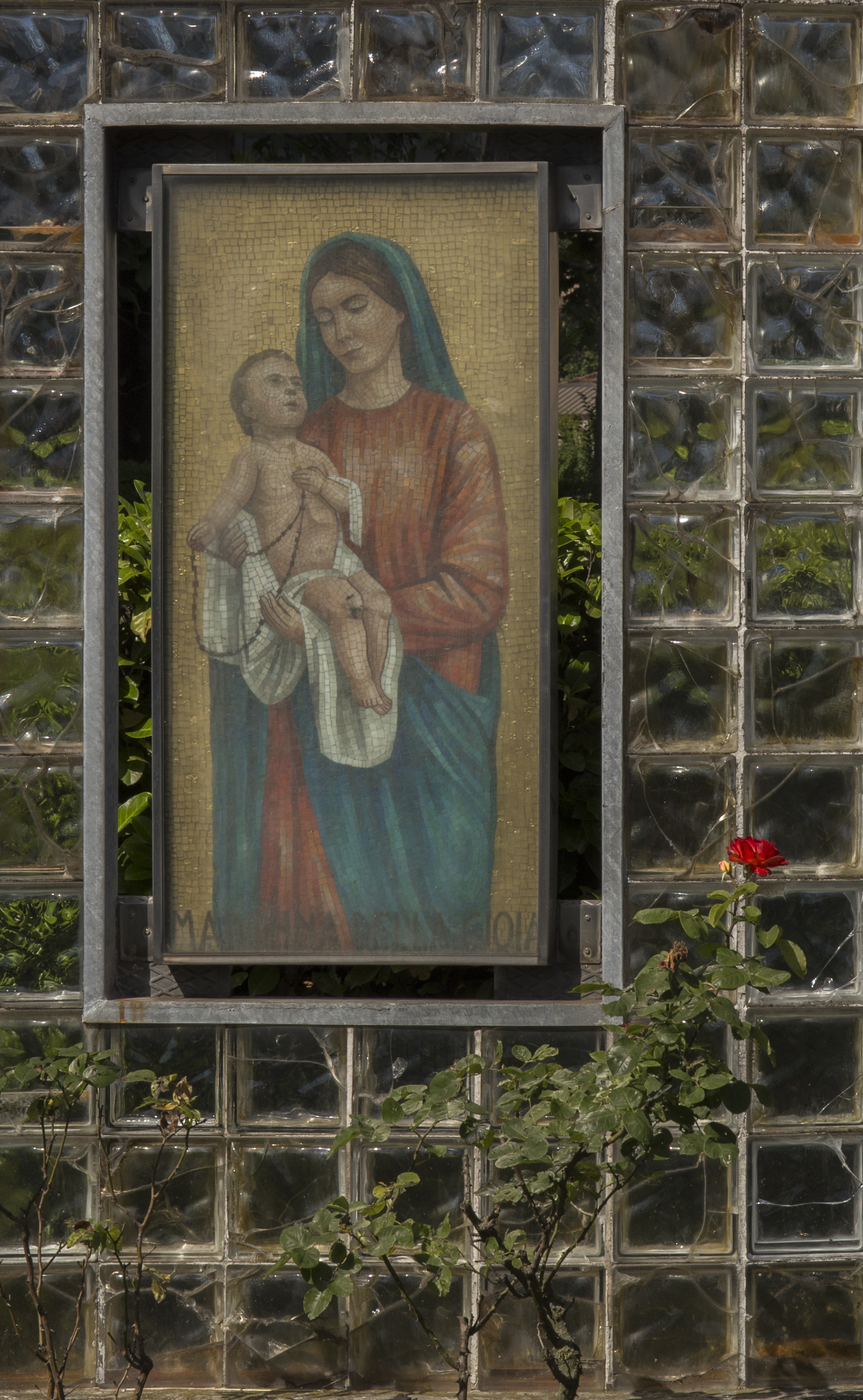 L'immagine votiva si ispira all'iconografia classica della Madonna con il Bambino Gesù fra le braccia.