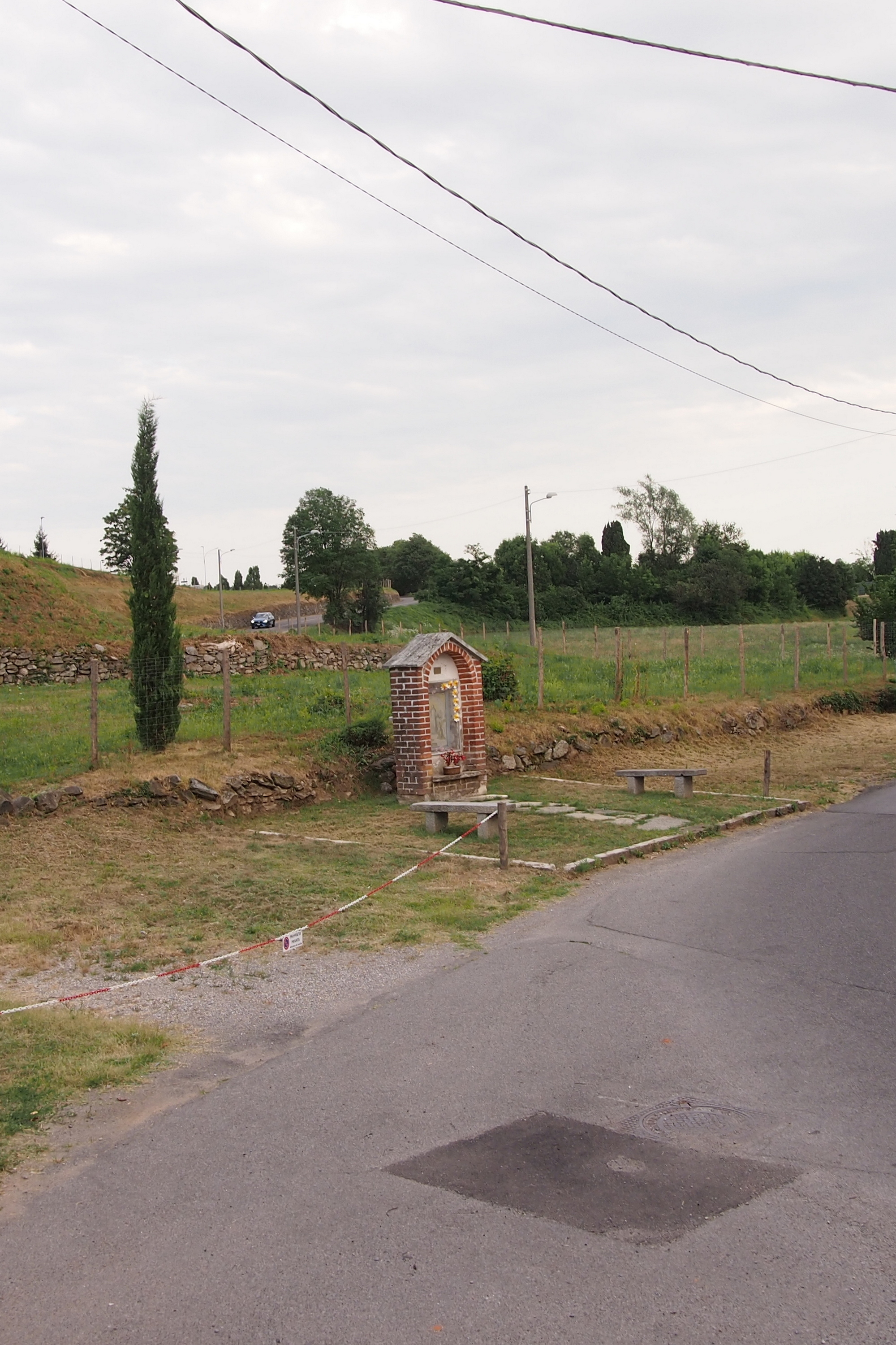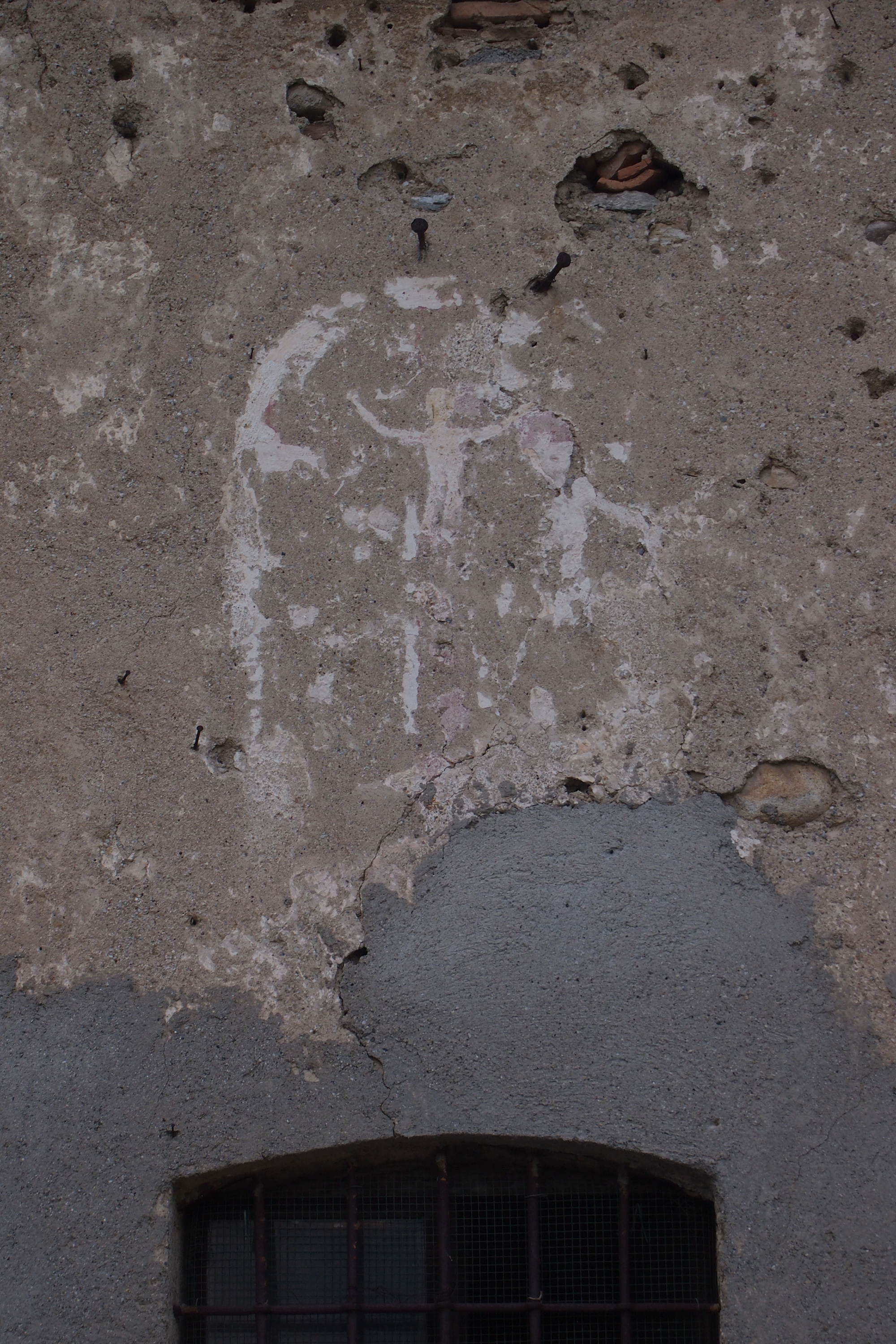 Crocifisso quasi cancellato, sul muro di una cascina ormai diroccata nella frazione Fabbrica Durini del Comune di Alzate Brianza. Il Crocifisso guarda verso un'altra edicola.