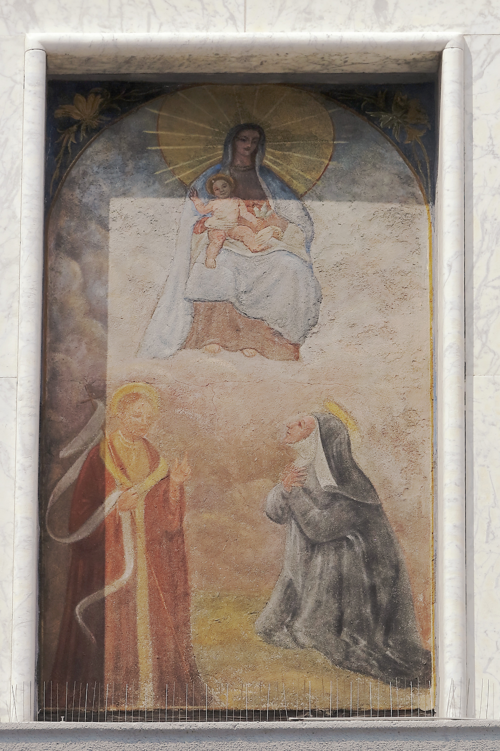 Il dipinto è collocato in una zona centrale di Monza, vicino alla Chiesa di Santa Maria Maddalena (chiamata anche delle Sacramentine); la Santa in abito da suora dovrebbe essere Santa Maria Maddalena de’ Pazzi, mentre la figura maschile sulla sinistra potrebbe raffigurare Sant’Agostino.