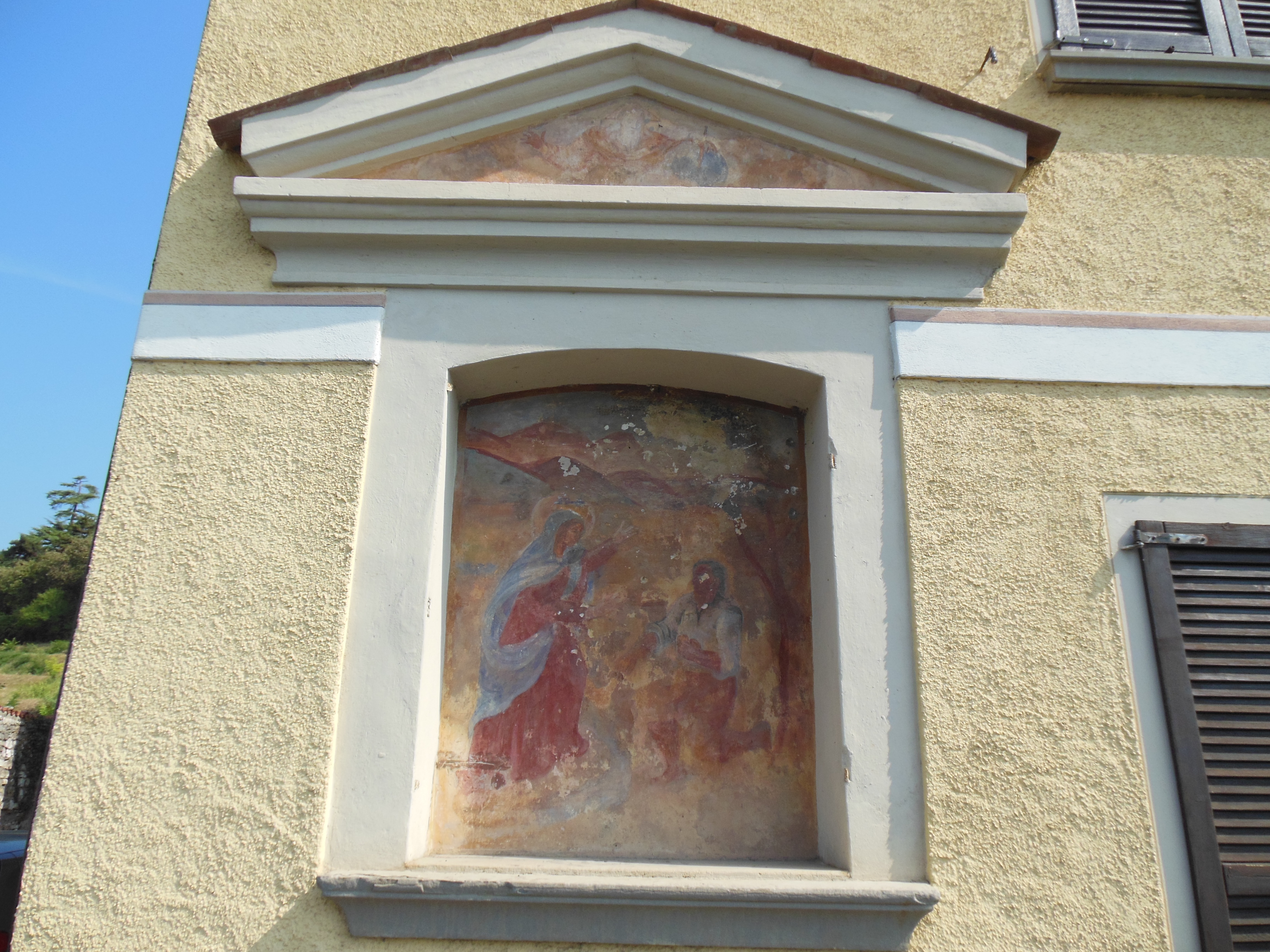 Nel dipinto sullo sfondo c'è un paesaggio collinare ed in primo piano un contadino inginocchiato davanti alla Madonna. Autore sconosciuto.