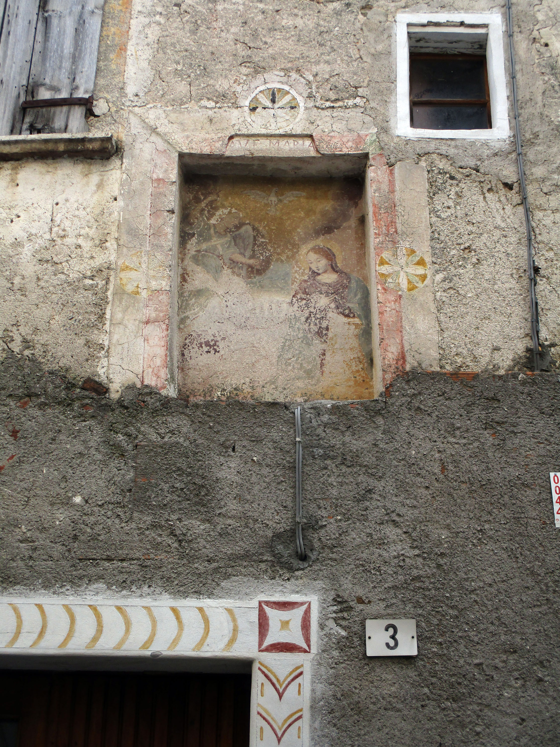 Affresco molto deteriorato. Sembra di riconoscere la scena della Annunciazione. Il cemento dei lavori di ristrutturazione della facciata ha sfiorato il bordo inferiore dell’affresco. In evidenza i fili del telefono.