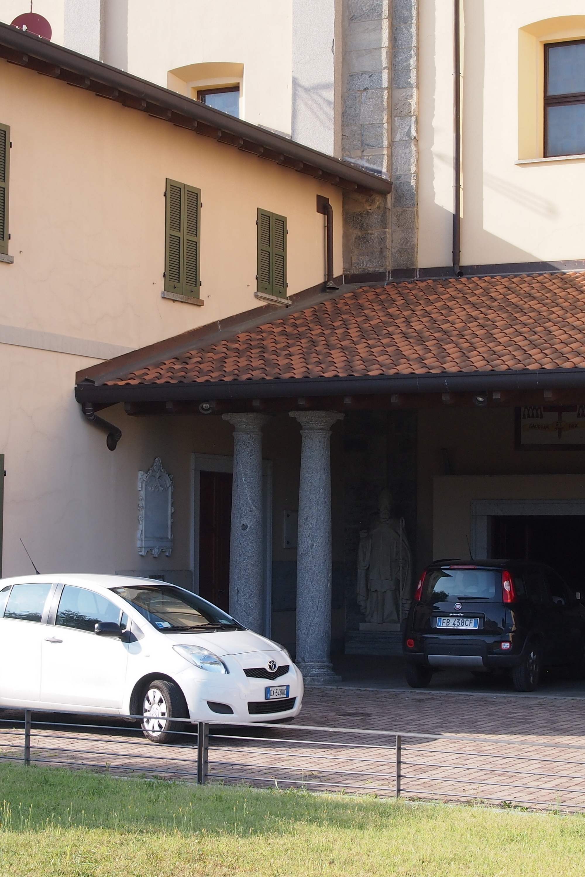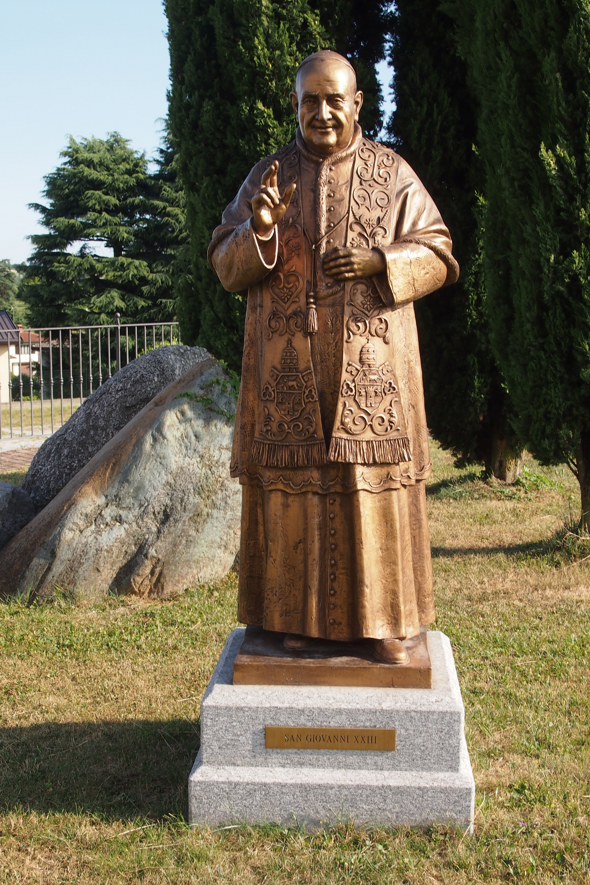 Statua di San Giovanni XXIII nel giardino della chiesa parrocchiale di Renate. La statua guarda verso un ingresso laterale della chiesa.
