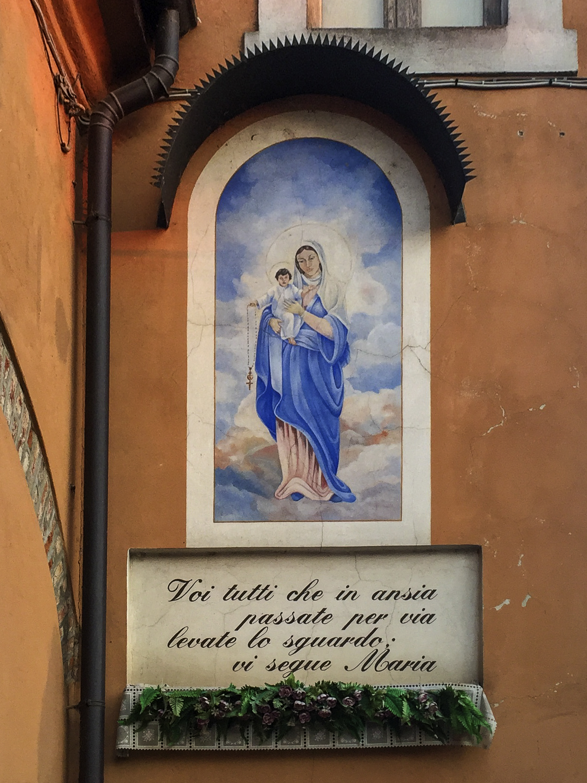 Immagine sul retro di casa Molinari dipinta intorno al 1940 dal pittore Zoncada e ridipinta nel 1991 da Olmo Seresini. Chiamata Madonna del Viandante per la scritta sotto la effige