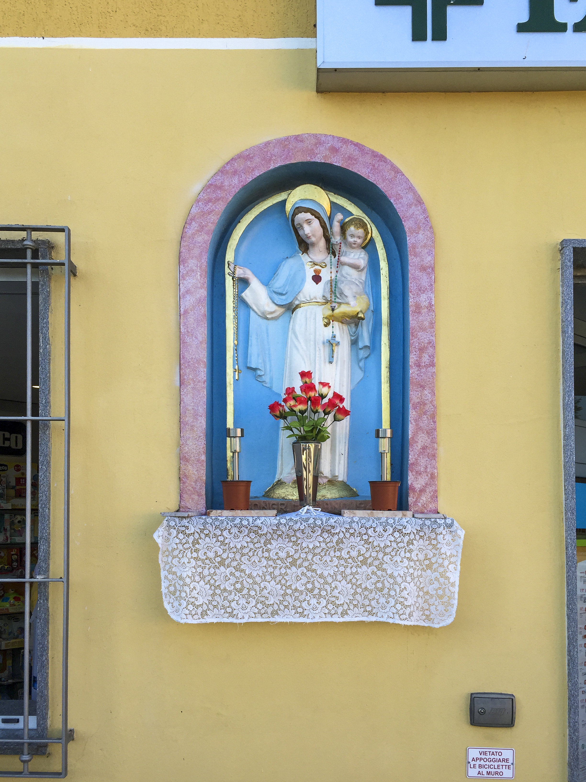 Madonna in terracotta dipinta riporta la scritta " Anno Mariano 1949". E' collocata sulla facciata della Farmacia di Casalmaiocco