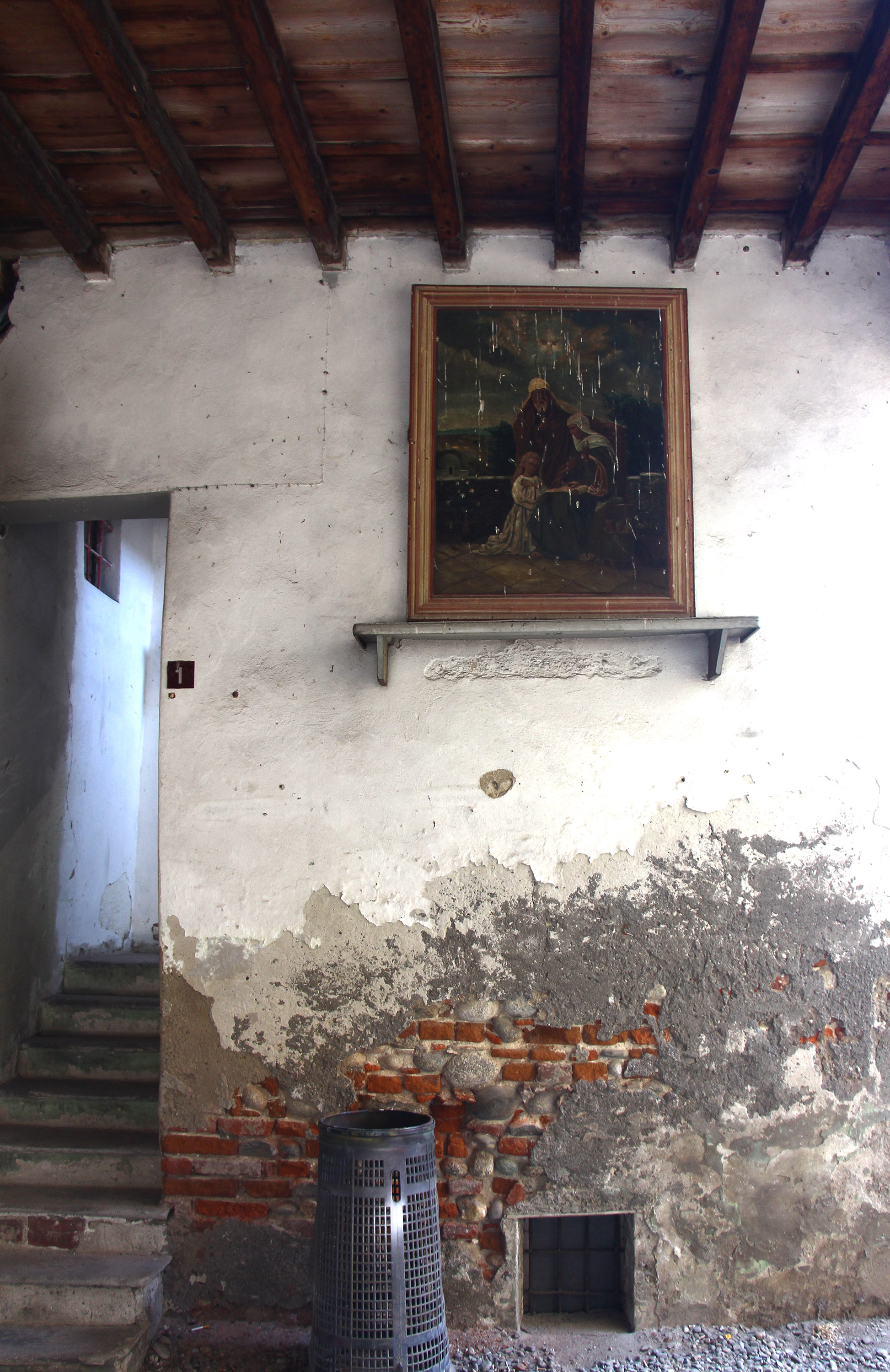 La collocazione del quadro sopra una mensola in pietra lascia pensare sia stato messo lì in sostituzione di un antico affresco ormai illeggibile.