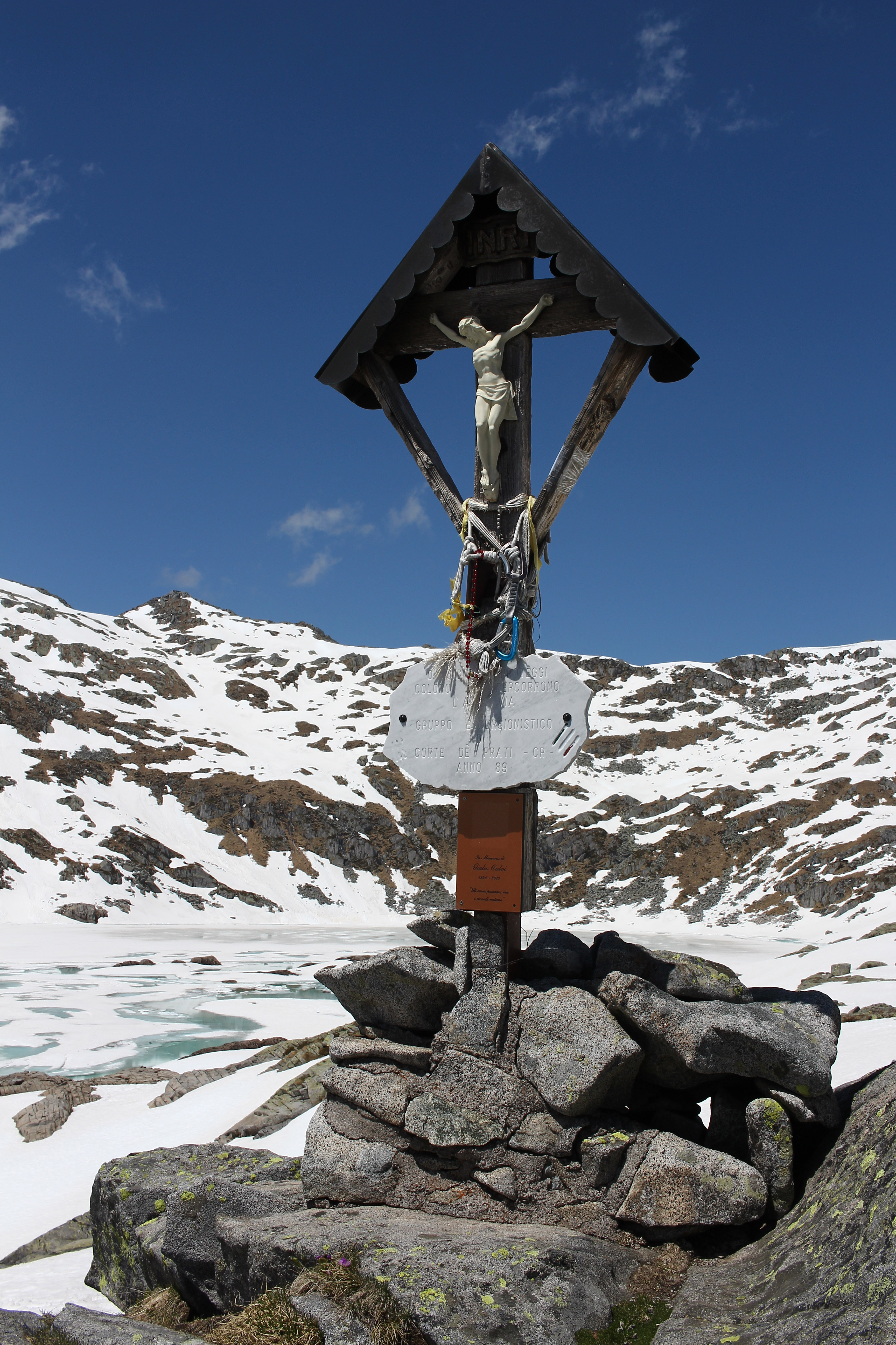 Semplice statuetta in plastica su croce di legno, situata su un dosso di granito tra il lago ed il Rif. Tita Secchi, ai piedi della arcigna parete ovest del Cornone di Blumone.