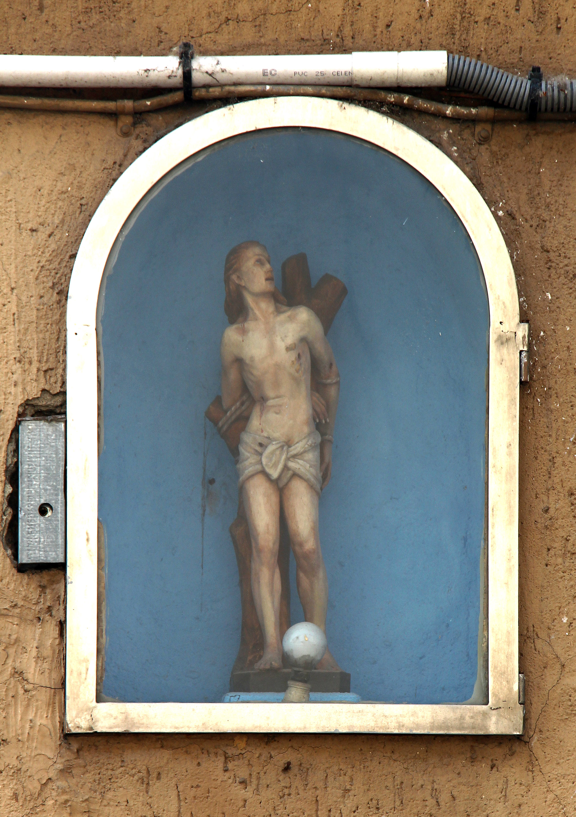 Piccola nicchia con la statuetta di S. Sebastiano collocata all'inizio della via omonima. La vista é sul muro di villa Brivio.