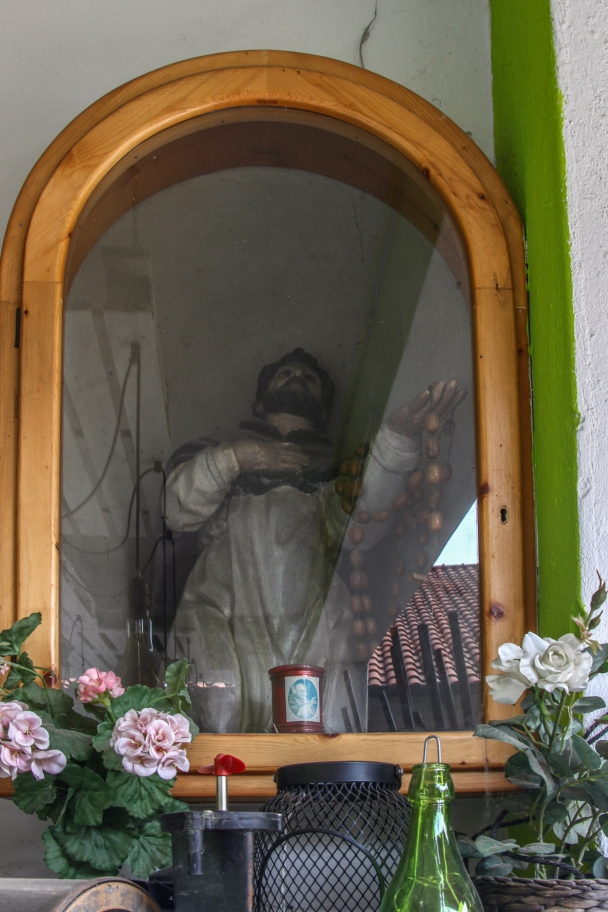 La statuetta, in legno di gelso, risalente al 1500, ritrae S. Domenico di Guzman, frate spagnolo, fondatore dell'ordine dei Predicatori (più noti come Domenicani), morto a Bologna nel 1221 e proclamato santo nel 1234. San Domenico porta sulle spalle la mantella nera tipica dell'ordine e reca in mano una corona del rosario dai grossi grani. La tradizione vuole infatti che Domenico ebbe la visione di Maria che gli indicò proprio la recita del Rosario come l'arma più efficace per combattere l'eresia dei Catari, missione questa alla base della fondazione del nuovo ordine.