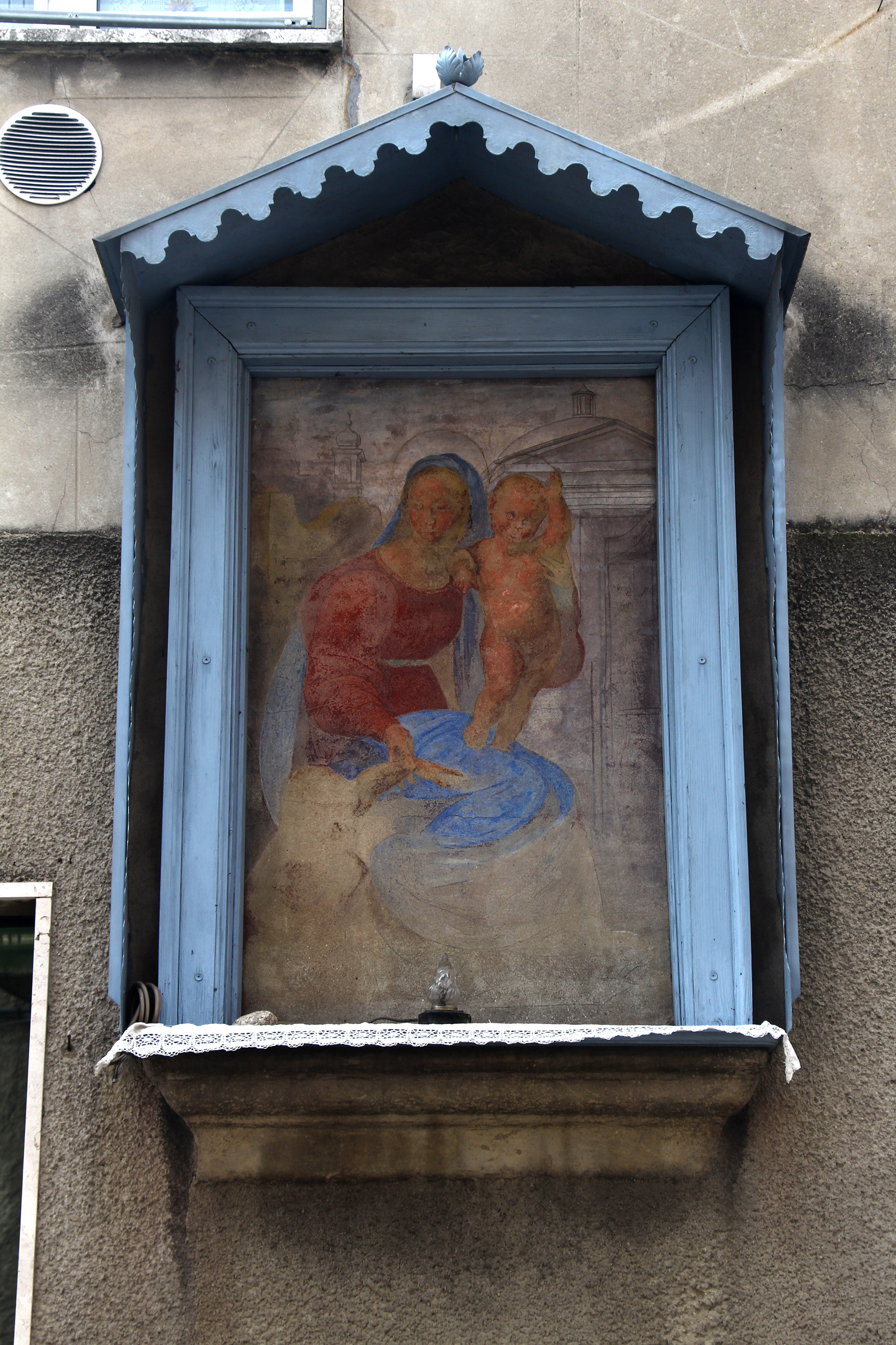 "L'affresco, di autore ignoto é databile tra la fine del sec XVI e l'inizio del XVII. Rappresenta un ex-voto per una grazia ricevuta dal "devoto" il quale (come narra la credenza popolare) deve essersi trovato in pericolo di vita caendo nel pozzo e, invocata la grazia delle Madonna, ne venne salvato. A questo fatto si deve la realizzazione dell'affresco quale ringraziamento. La chiesa che si intravede alle spalle della Madonna é un santuario della zona.