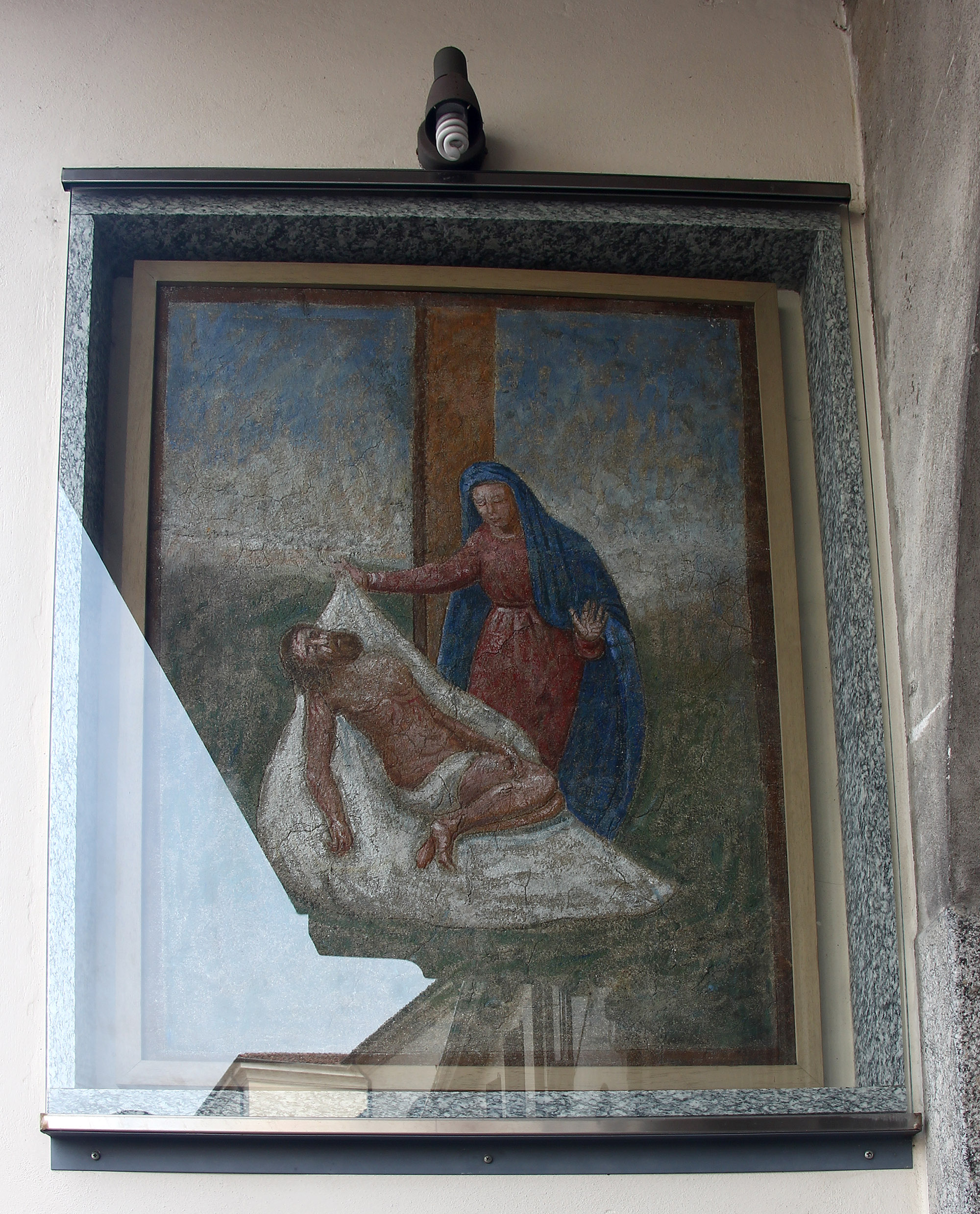 L'affresco, di fattura molto semplice, raffigura una scena classica della deposizione: Maria avvolge amorosamente con un telo bianco Gesù morto. Alle loro spalle si vede una parte della croce su uno sfondo di prato e cielo senza nessun dettaglio.