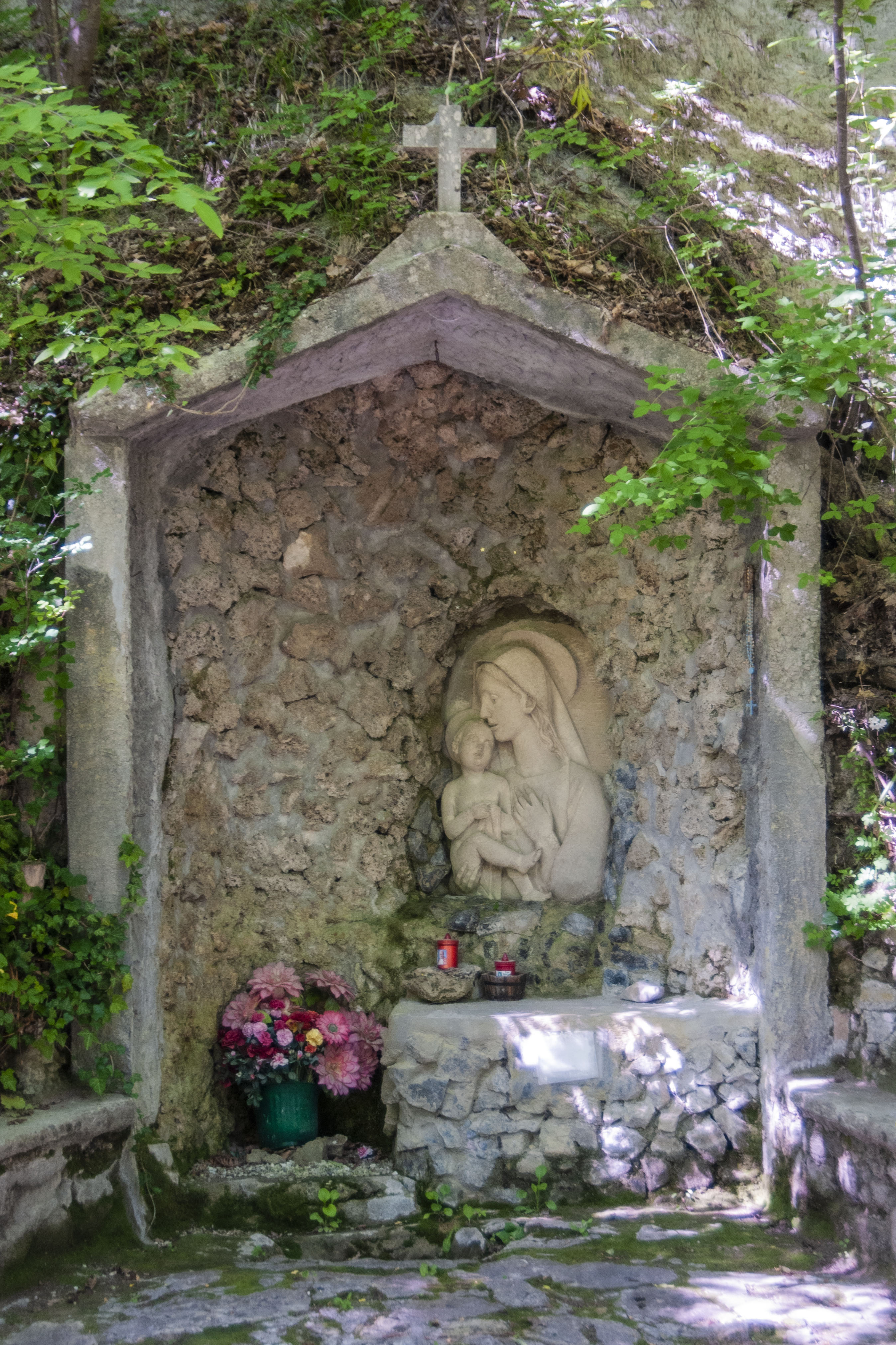 La Madonna del Turista, realizzata nel 1966 dallo scultore Vittorio Grilli prima scolpita nella roccia (che è risultata poi troppo friabile) e poi (nel 1972) su altra pietra murata al posto della precedente. Da quasi 50 anni, grazie ad una iniziativa del parroco dell’epoca Don Davide Monteverdi, la sera della prima domenica d’agosto, festa della Madonna del Turista e festa patronale di Sant’ Albano, si celebra il rito della processione “aux flambeaux” che parte dalla chiesa e arriva all’edicola.