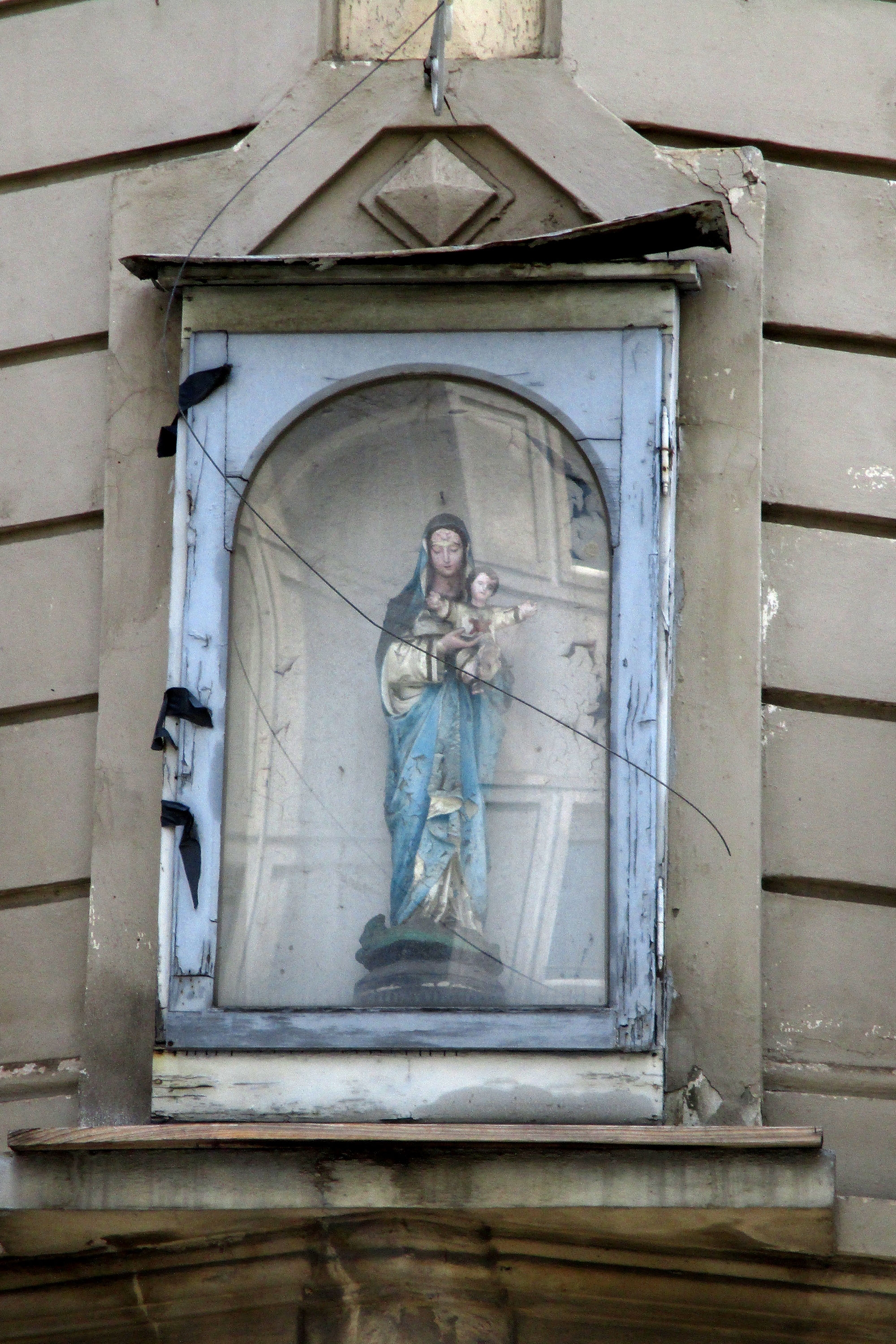 Tradizionale Madonnina sull’angolo di un palazzo al cui piano terra si trovano un negozio di cibo cingalese ed uno di cibo indiano.
