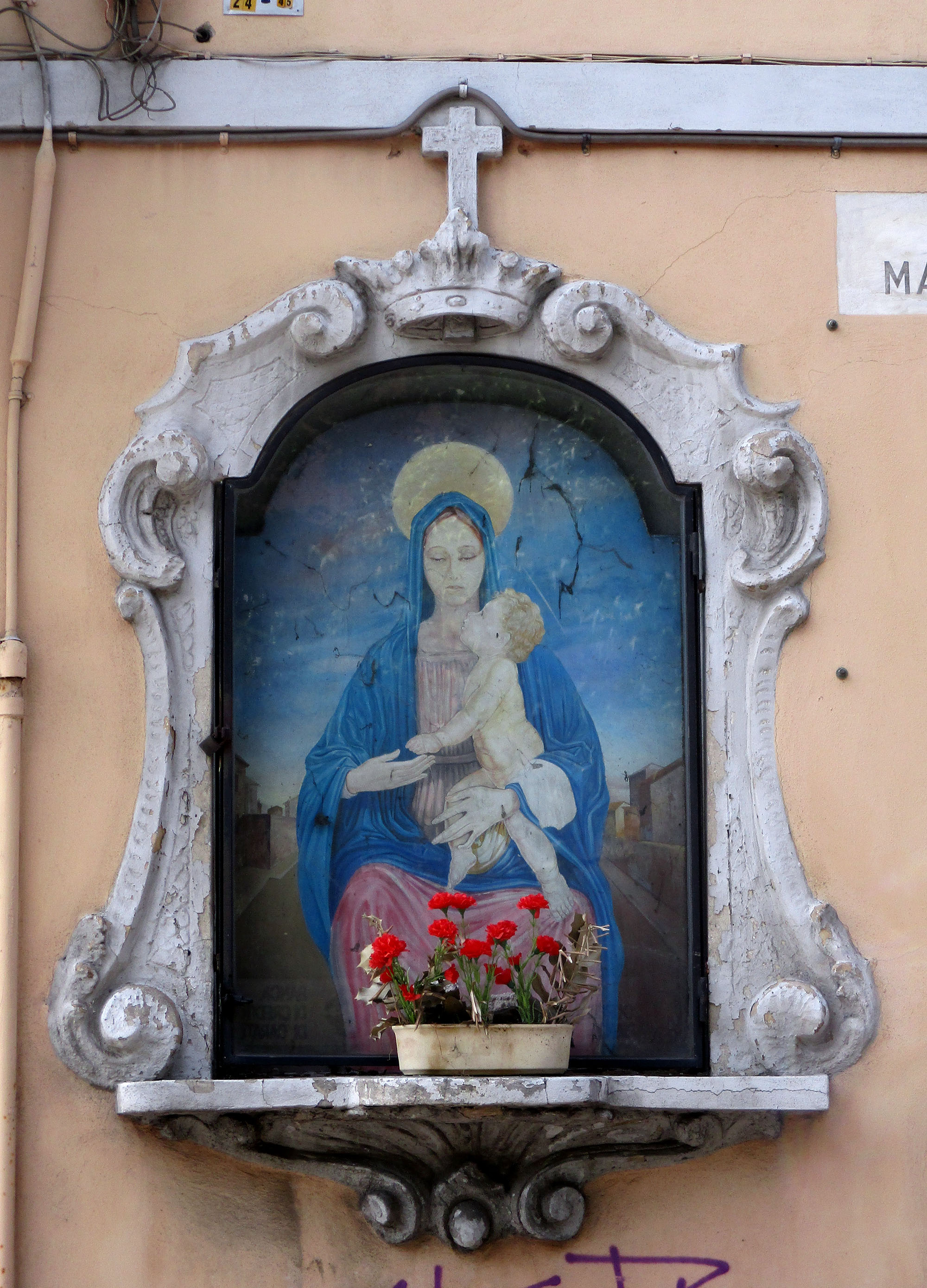 La Madonna con il Bambino in braccio è ritratta sullo sfondo di una strada che potrebbe essere proprio Via Madonnina che termina qui.