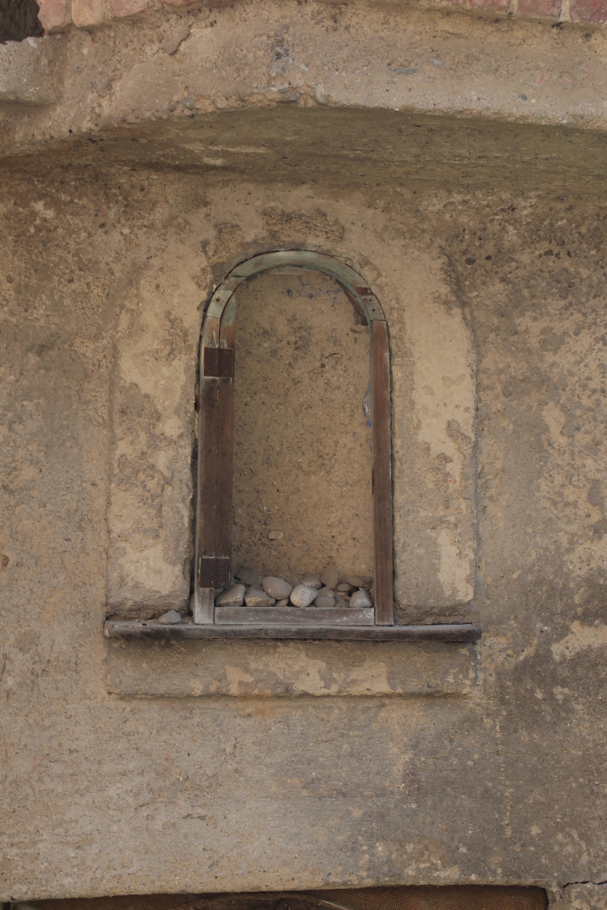 Nicchia vuota sopra una porta di una cascina in stato di abbandono. Rimangono solo tracce di pittura di uno sfondo blu.