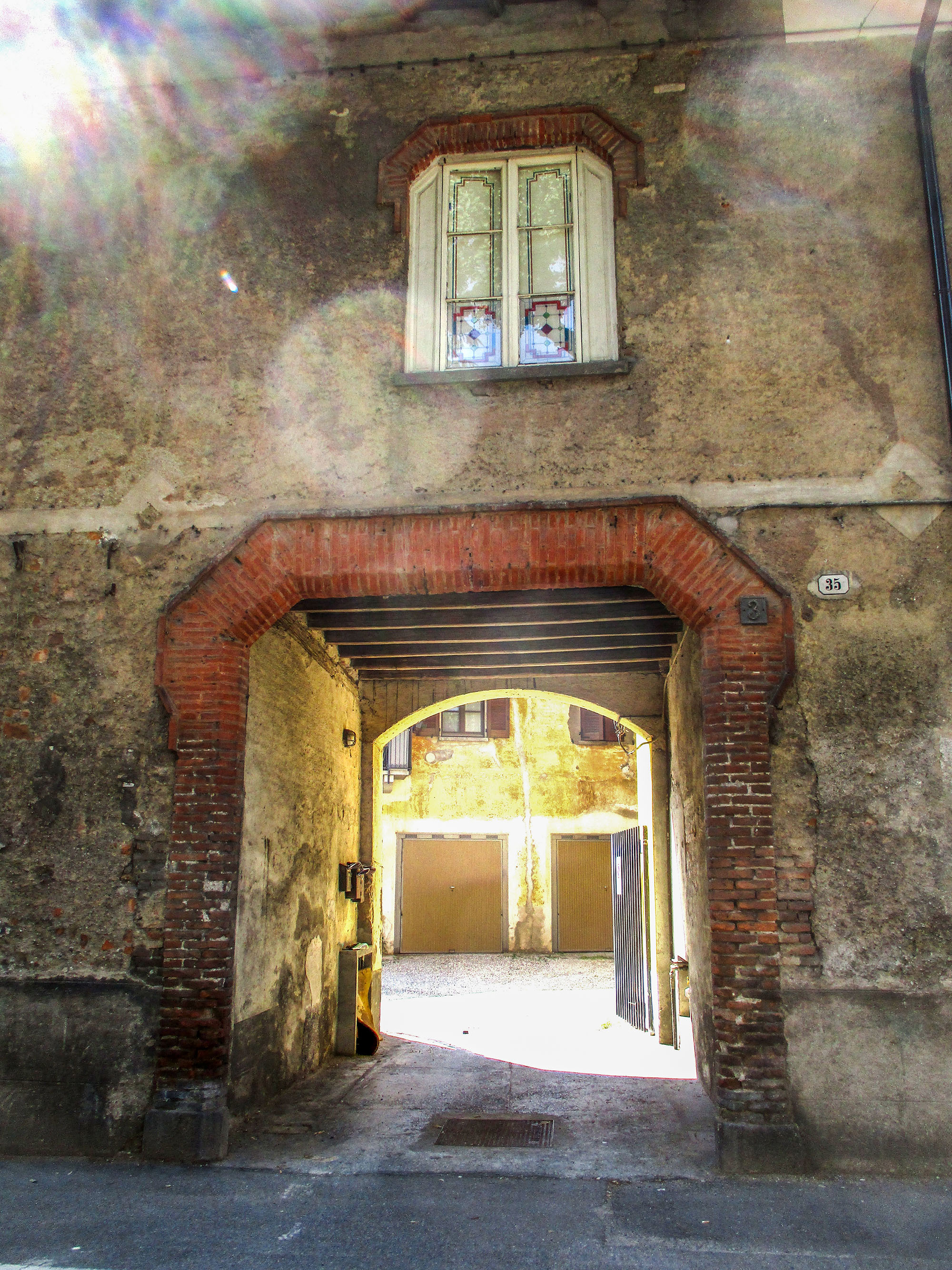 La vista è sul portico d’ingresso della corte sull’altro lato della strada, in quel tratto decisamente stretta.