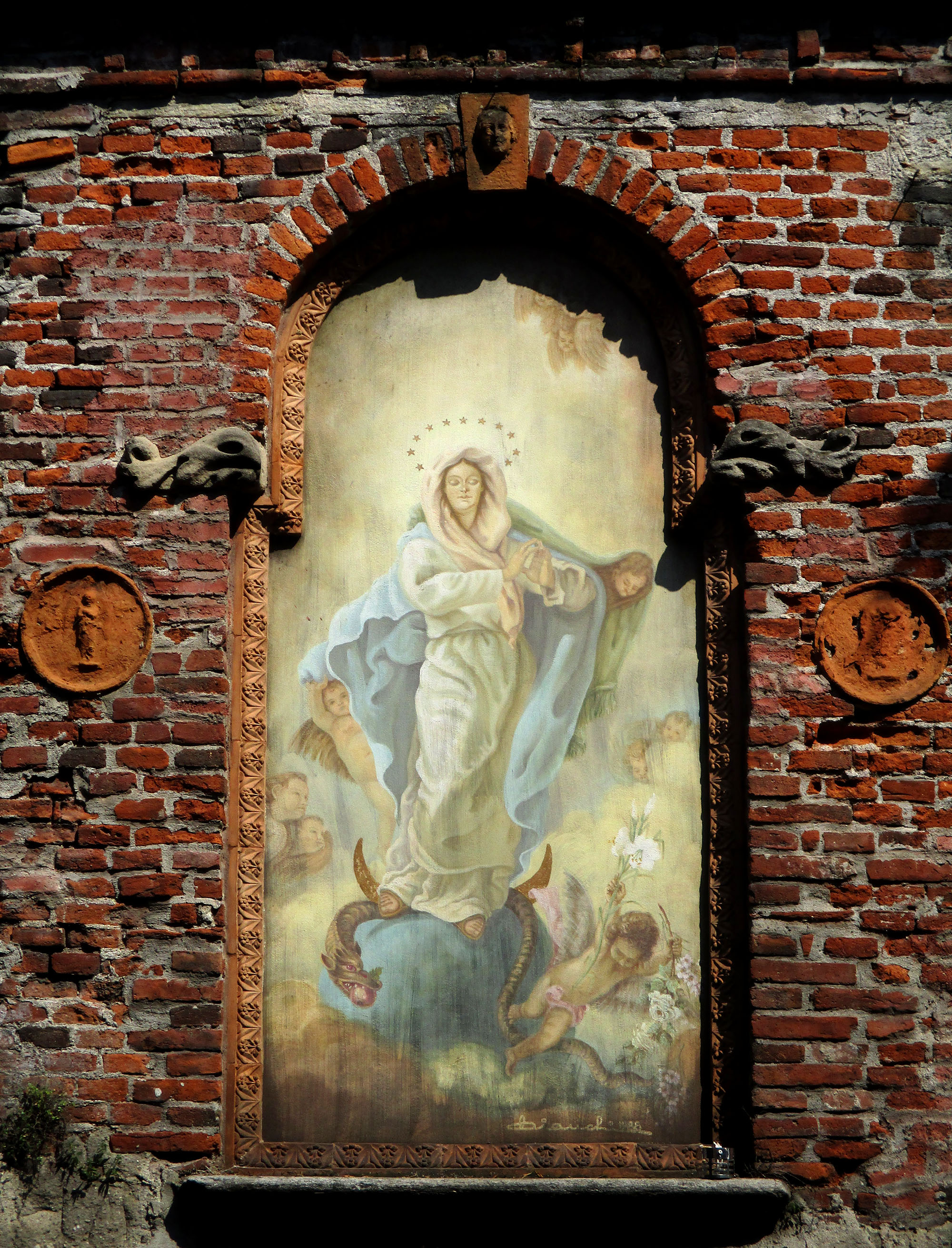 Molti particolari sono riprodotti esattamente, come la corona di stelle, il mantello e il velo di maria, la postura delle mani giunte, i putti festosi, il serpente con la mela dell’Eden in bocca e il piede che lo schiaccia.