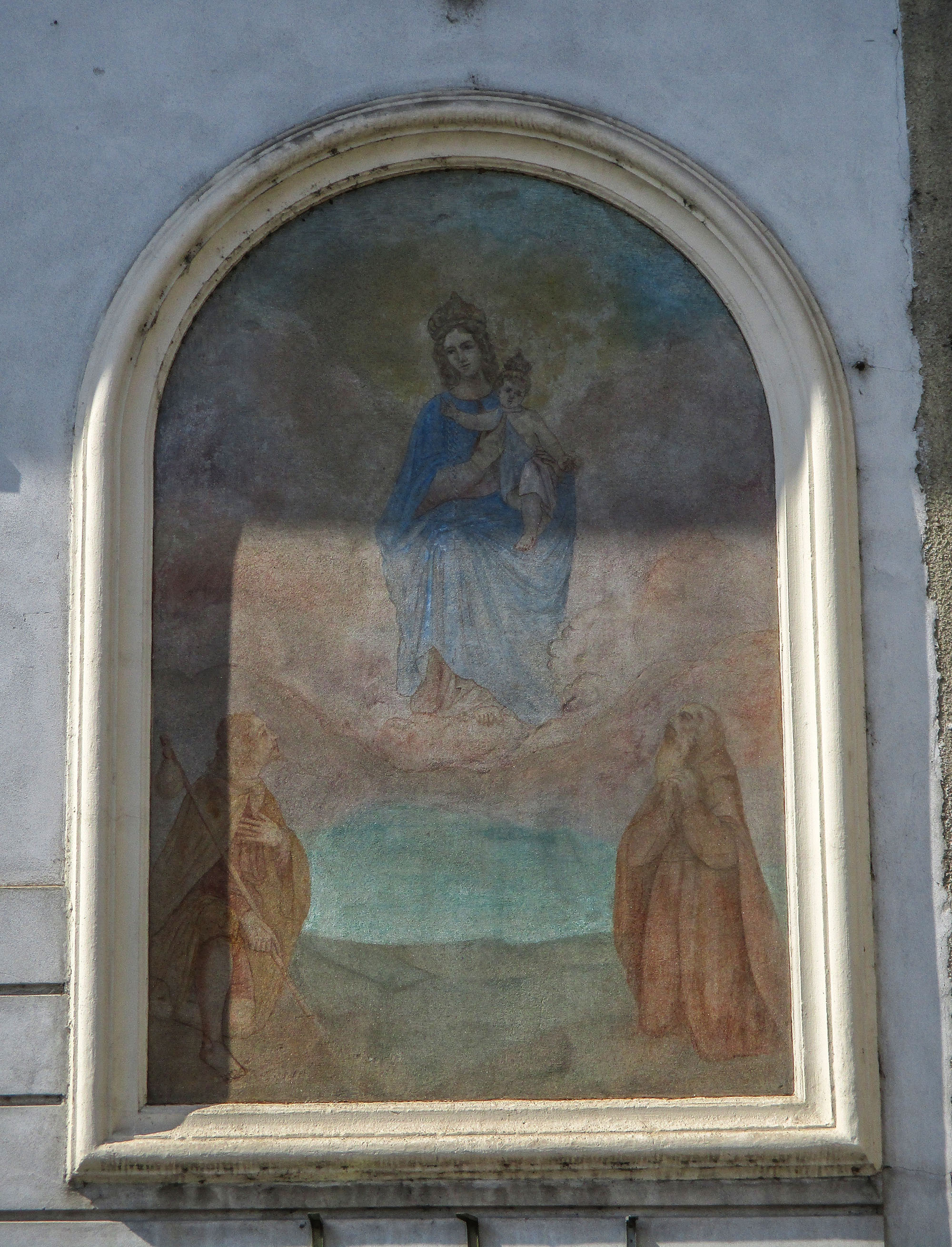 Quello a sinistra, potrebbe essere S. Rocco: il bastone e la zucca per l’acqua, simboli del pellegrino, e la piaga sulla gamba (curò gli appestati e si ammalò lui stesso).