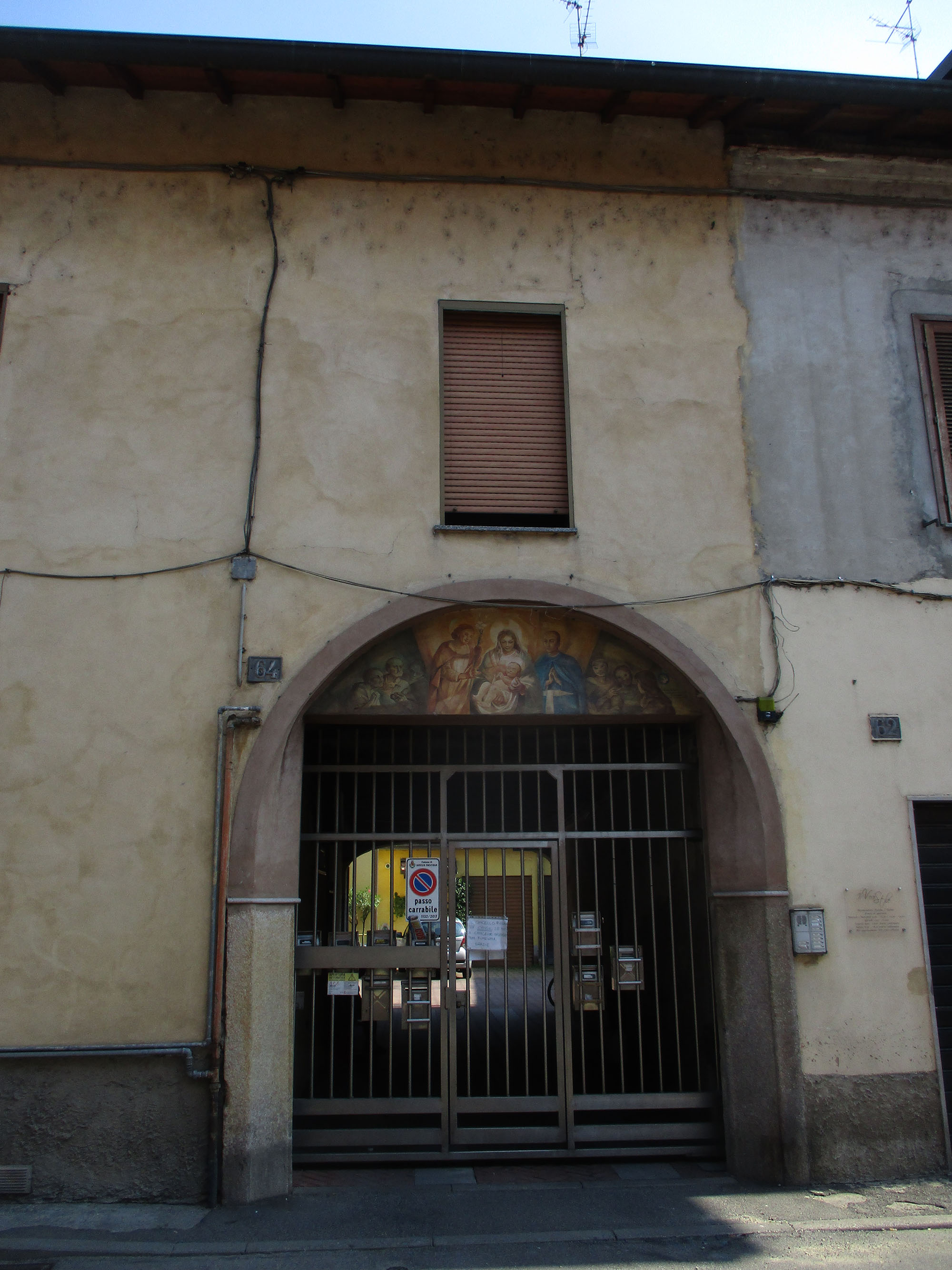 La vista è sul portone del numero 62, la cui lunetta ospita un affresco moderno.