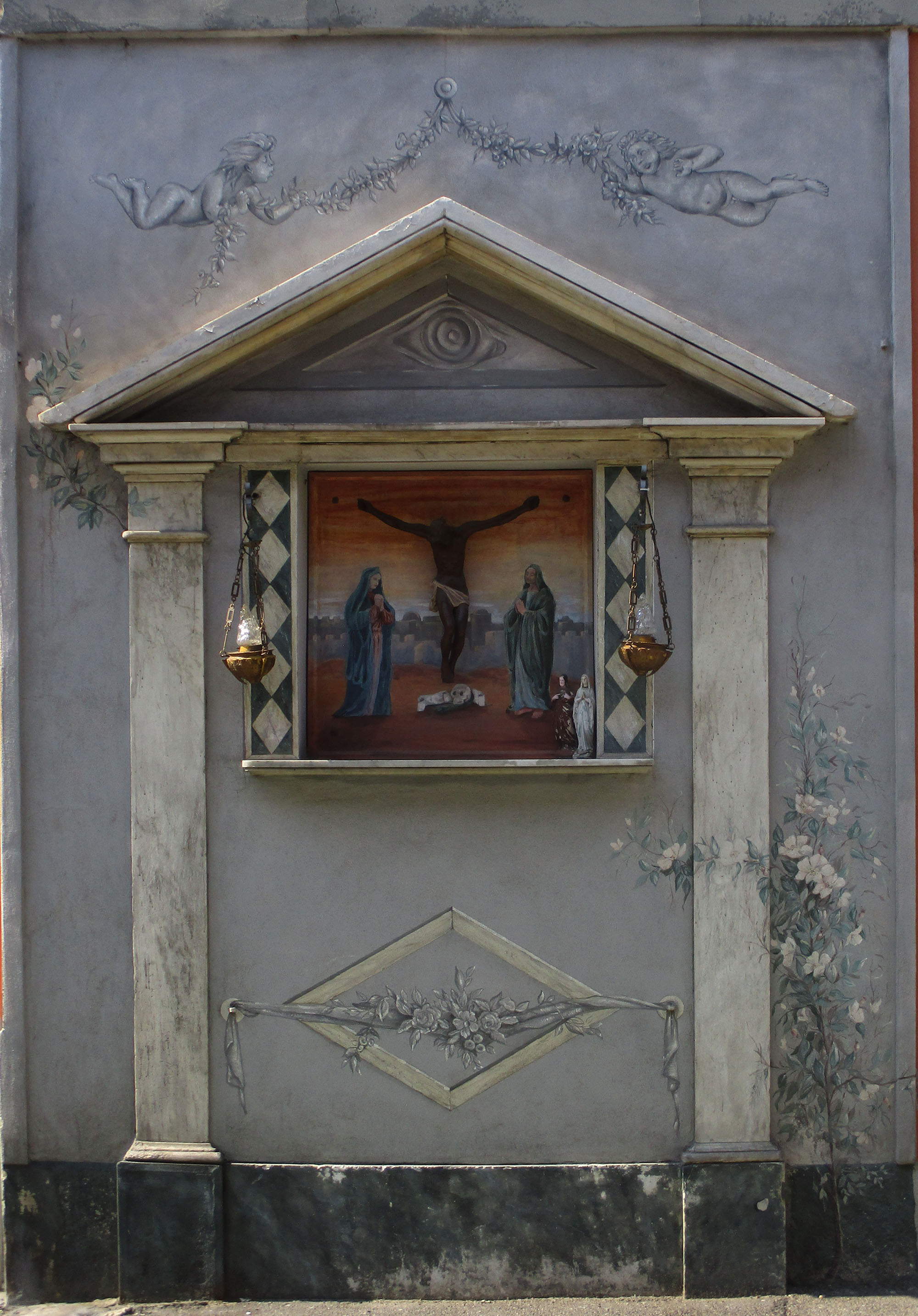 Inserito in un’elegante edicola con decorazioni dipinte, l’affresco ritrae la scena della morte di Gesù in croce. Accanto alla croce, due donne in preghiera. Sullo sfondo le mura della città, con i tetti a cupola che, quando eravamo bambini, erano un dettaglio essenziale nei presepi che disegnavamo.