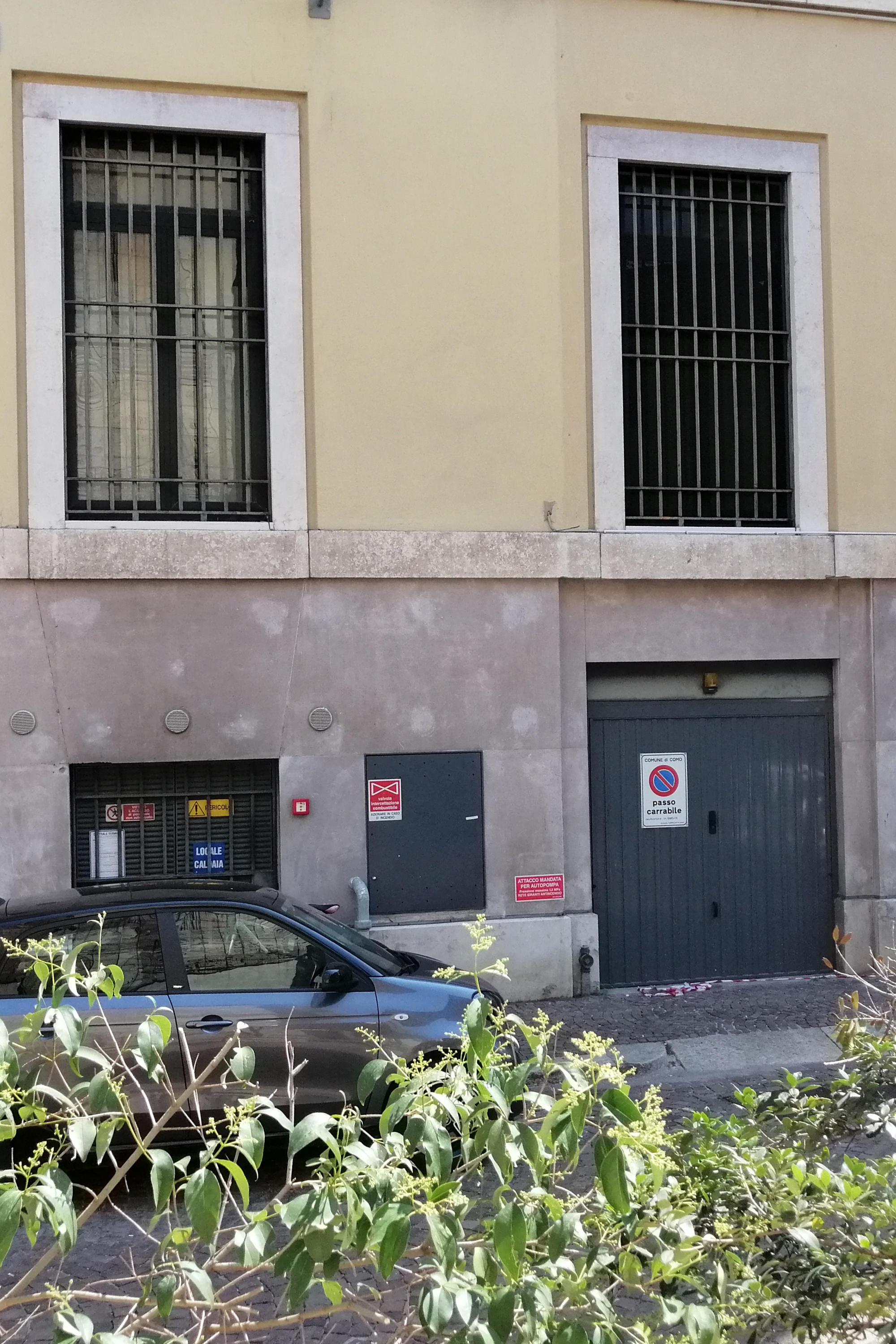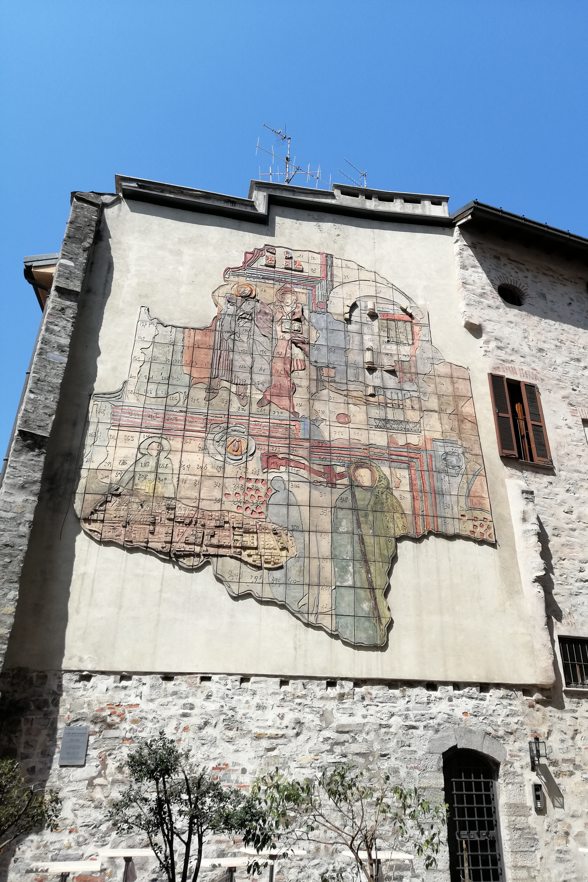 Opera in ceramica (2002) di Nino Lupica, che richiama gli affreschi della chiesa pre-esistente, demolita insieme a gran parte dell'antico quartiere della Cortesella nel 1938, a seguito dell'applicazione del nuovo piano regolatore. Tra le figure di Santi raffigurati, forse, Sant'Abbondio (patrono della Diocesi di Como) e i Santi Nazaro e Celso (ai quali era dedicata la chiesa demolita).