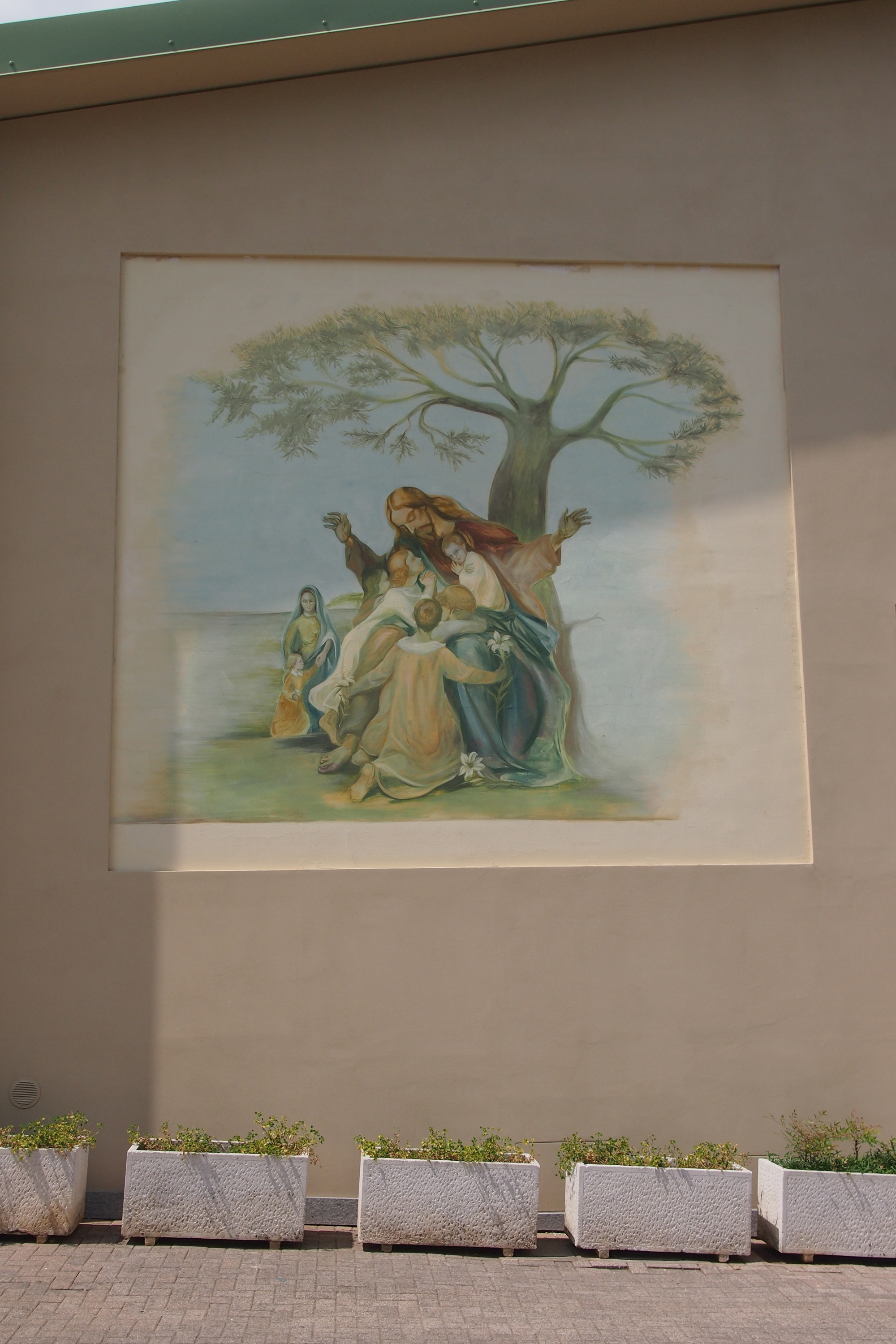 Murales all'interno dell'Oratorio di Lurago d'Erba. Rappresenta Gesù con dei bambini, probabilmente quello con il giglio in mano è San Luigi, al quale è dedicato l'Oratorio. Sullo sfondo, probabilmente Maria.