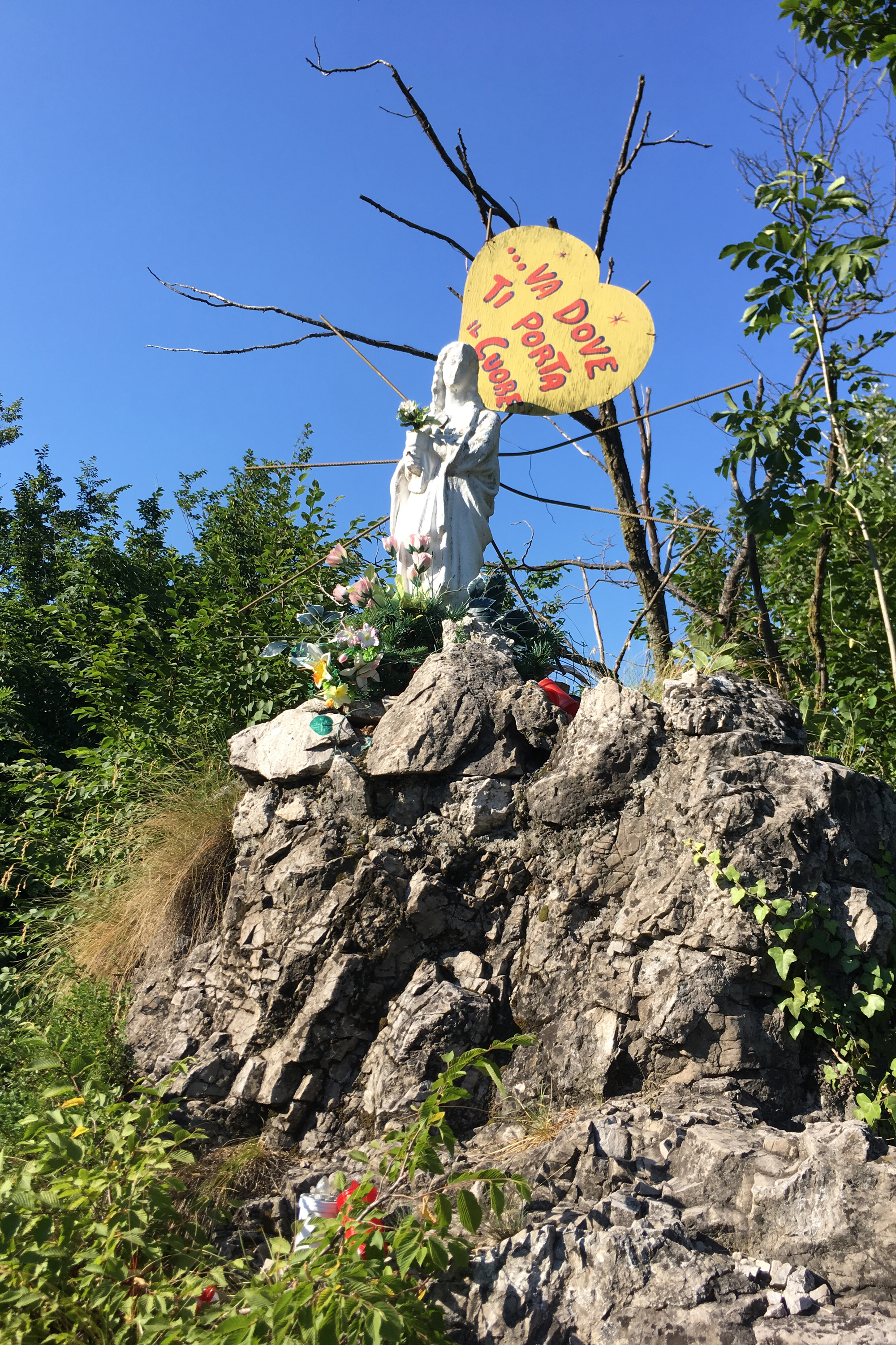 Madonna bianca sopra le rocce con fiori e accessori vari intorno