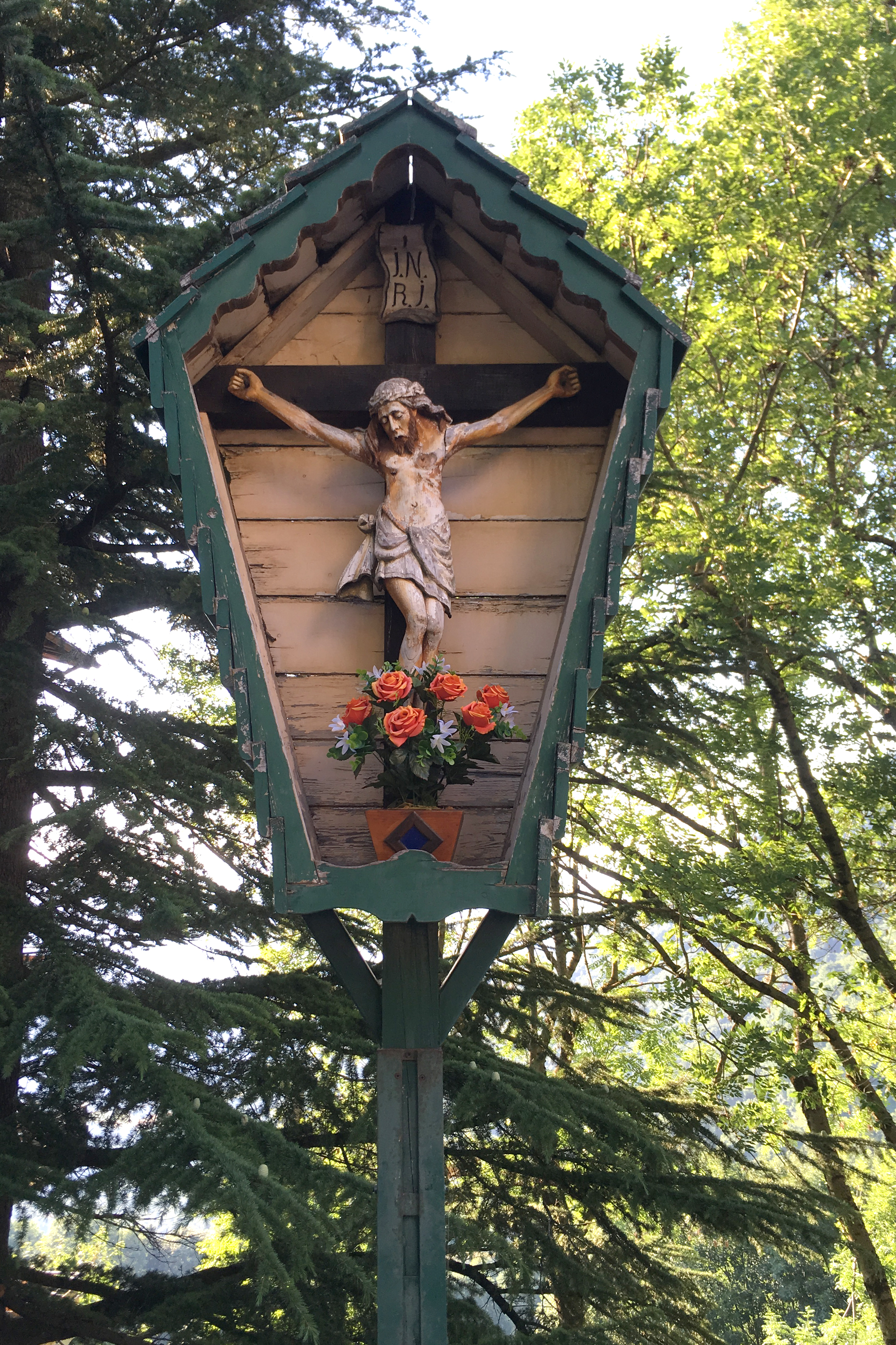 Tra la pizzeria e la cabinovia, al ciglio della strada. La sua edicola dipinta di verde è circondata da alberi sempreverdi.