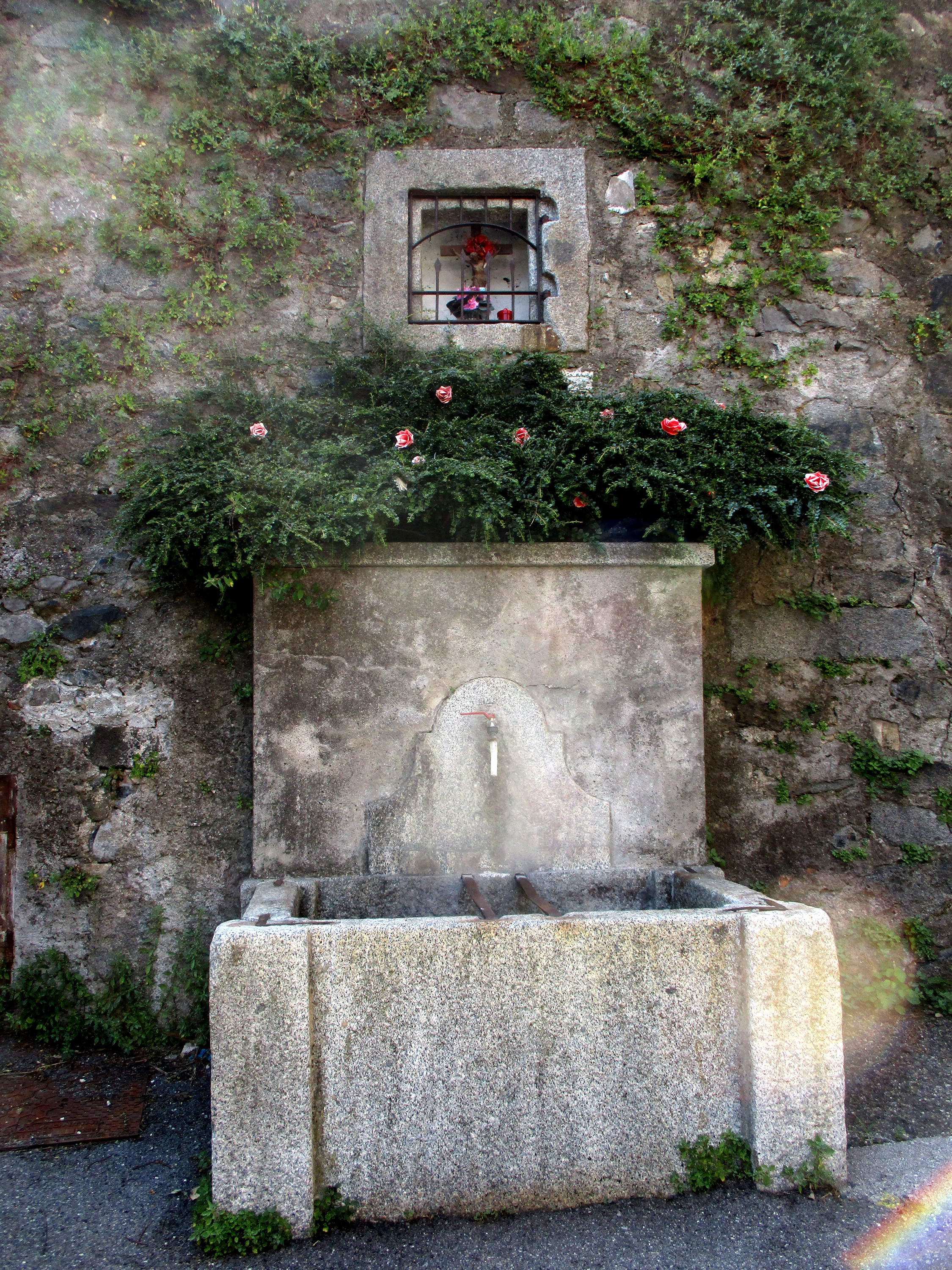 Piccola nicchia in pietra che racchiude un crocifisso. Elegante nella sua semplicità la grata anteriore.