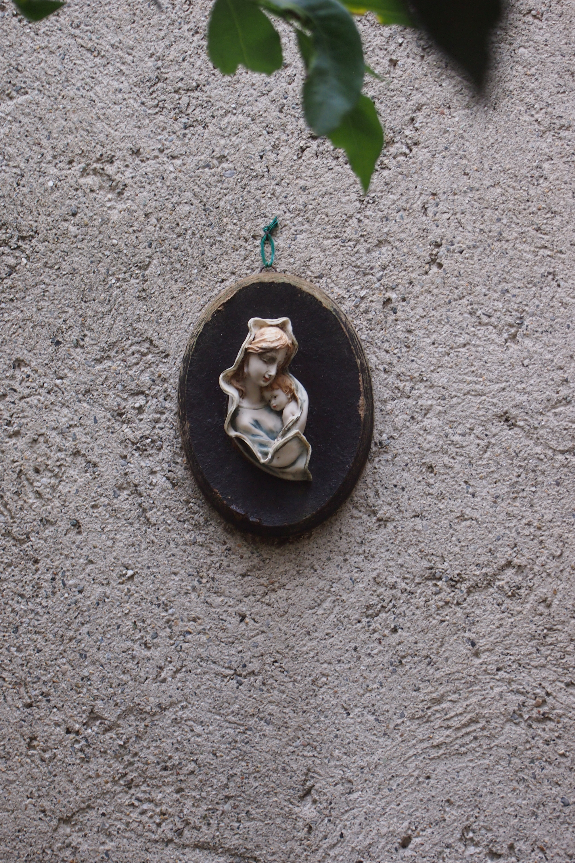 Piccolo quadretto di una Madonna con Bambino appeso nel cortile di una casa abbandonata. La Madonna guarda verso la strada.