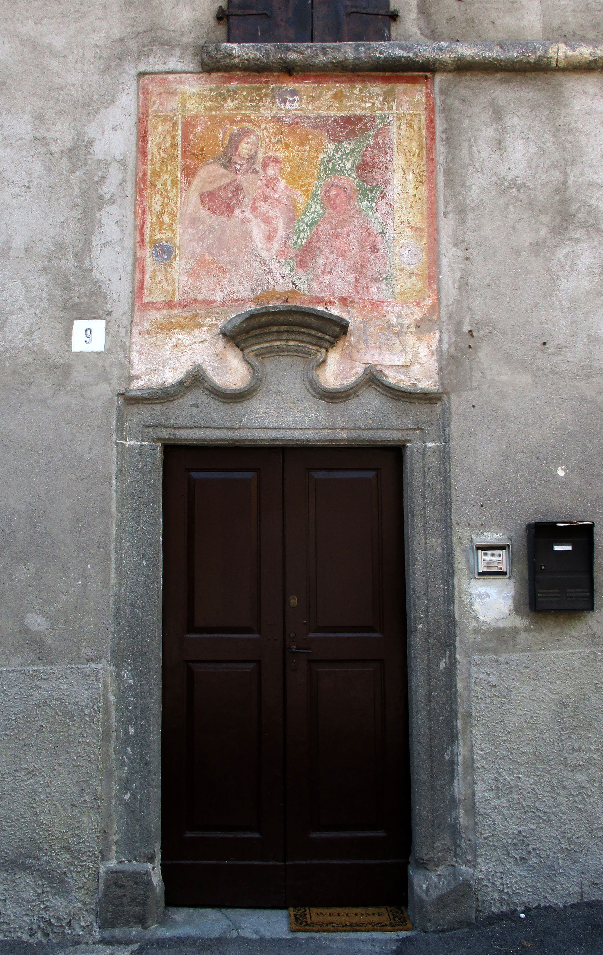 Affresco sulla facciata di una casa a decorare la porta di ingresso, già impreziosita da un elegante architrave in pietra. L’affresco é molto deteriorato: sono leggibili la Madonna col Bambino in braccio ed un santo, non identificabile, inginocchiato ai loro piedi. La cornice disegnata attorno e la bidimensionalità della rappresentazione lascerebbero pensare ad un’origine piuttosto antica.