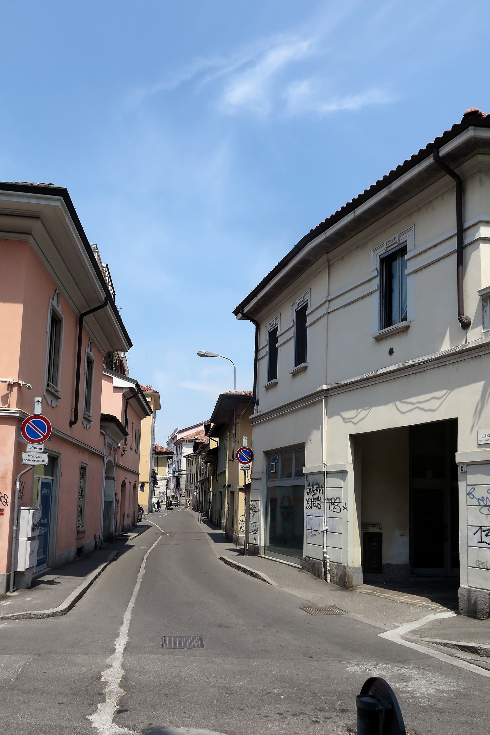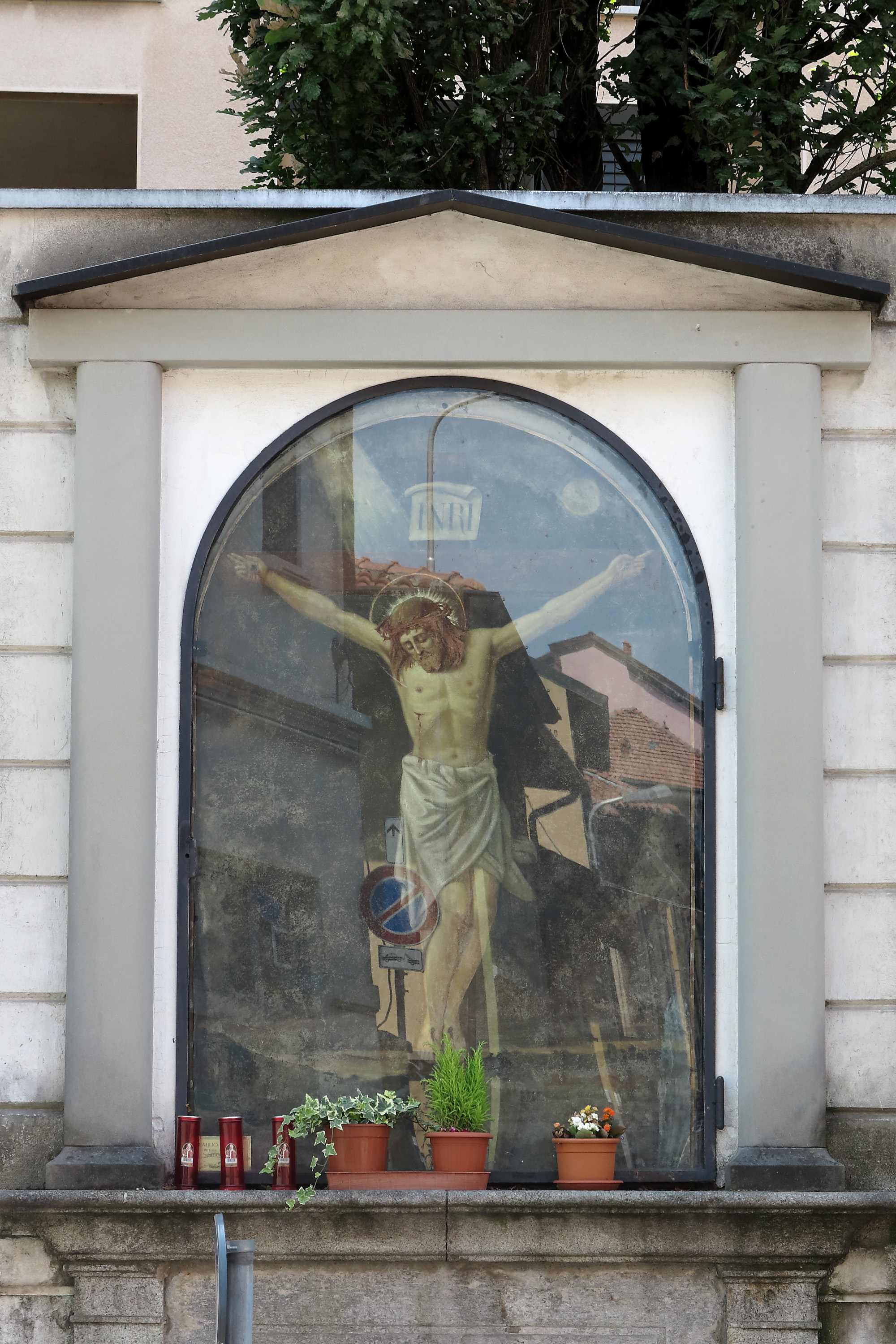 Il Crocifisso si trova vicino a quello che era il portone d’ingresso del cappellificio Cambiaghi, ora l’immobile è a destinazione residenziale. Un tempo era così importante e conosciuto da dare il nome alla via Carlo Porta, chiamata anche “via del Crocifisso” e si reggeva su un troncone di muro dello stabilimento.