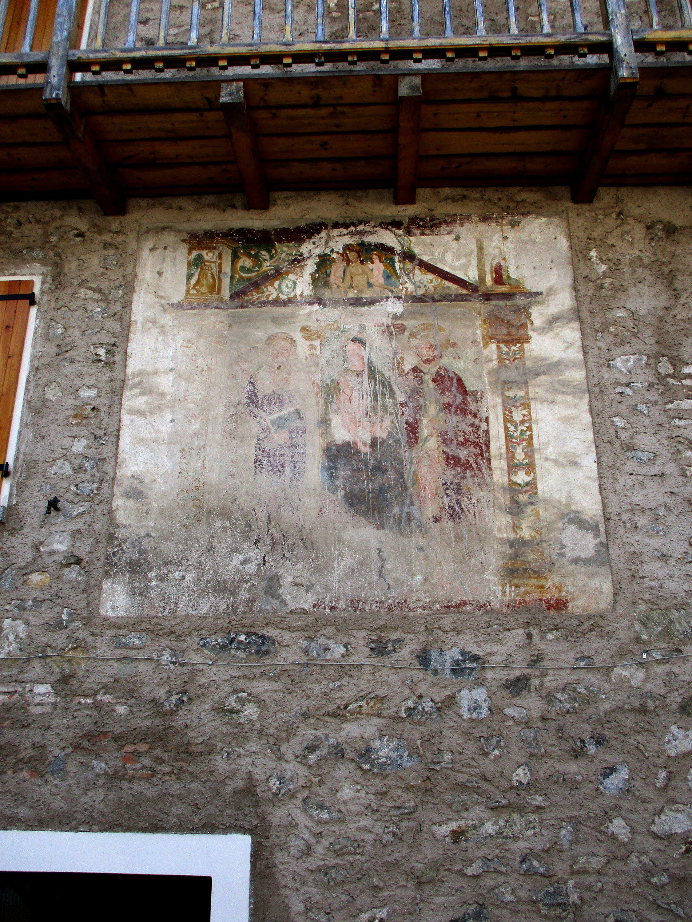 Affresco molto deteriorato. Al centro sembra di riconoscere la Madonna col Bambino. Ai lati due figure, una delle quali ha in mano un libro. Per le mie scarse conoscenze, indecifrabile.