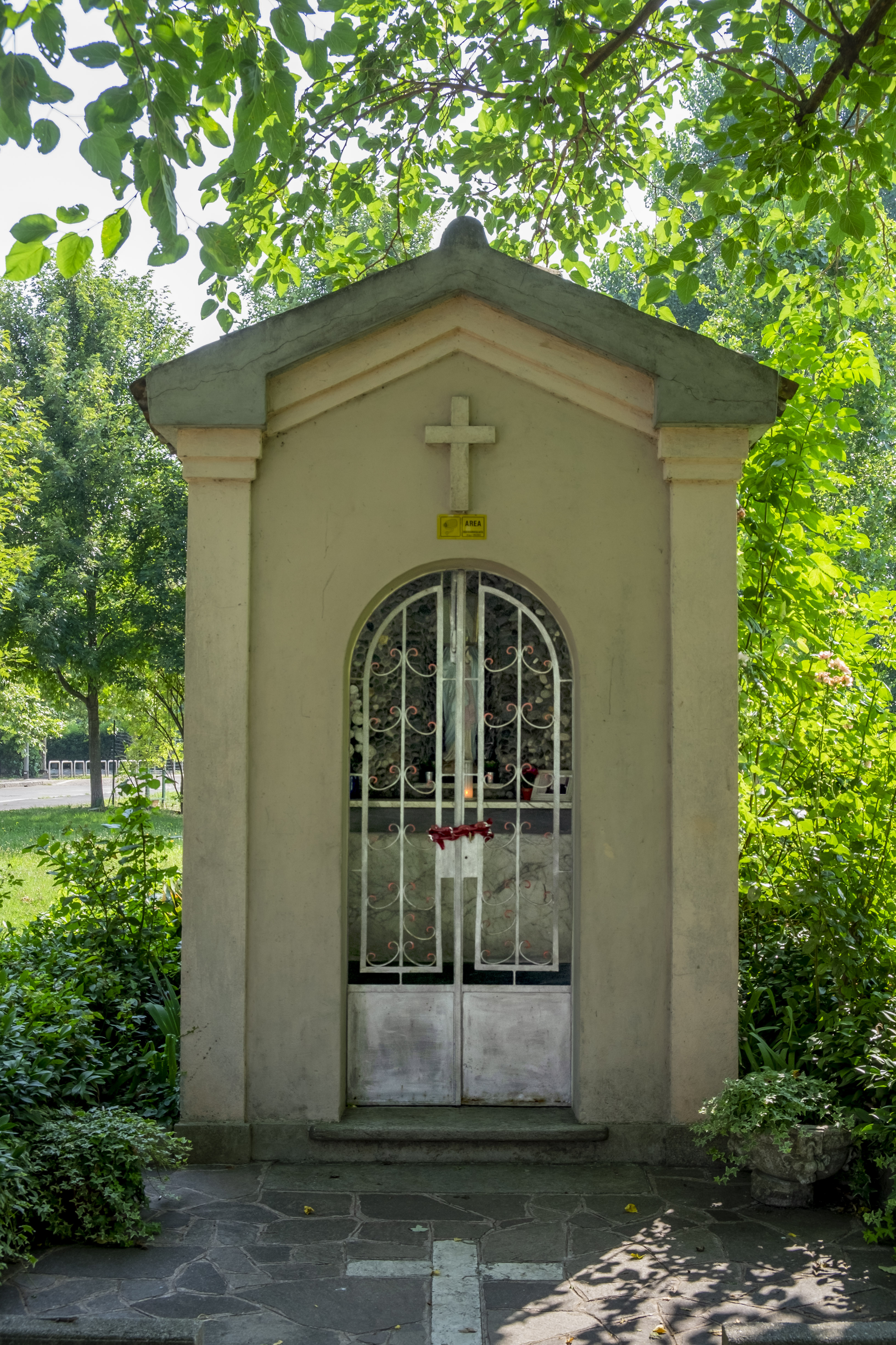 All'interno, si scorge un altare sul quale spiccano una statuetta che riproduce la Madonna di Lourdes, la fotografia di una persona anziana e un cero sempre acceso.Voci di quartiere identificano il personaggio della foto come signora Galimberti che qui riposa.