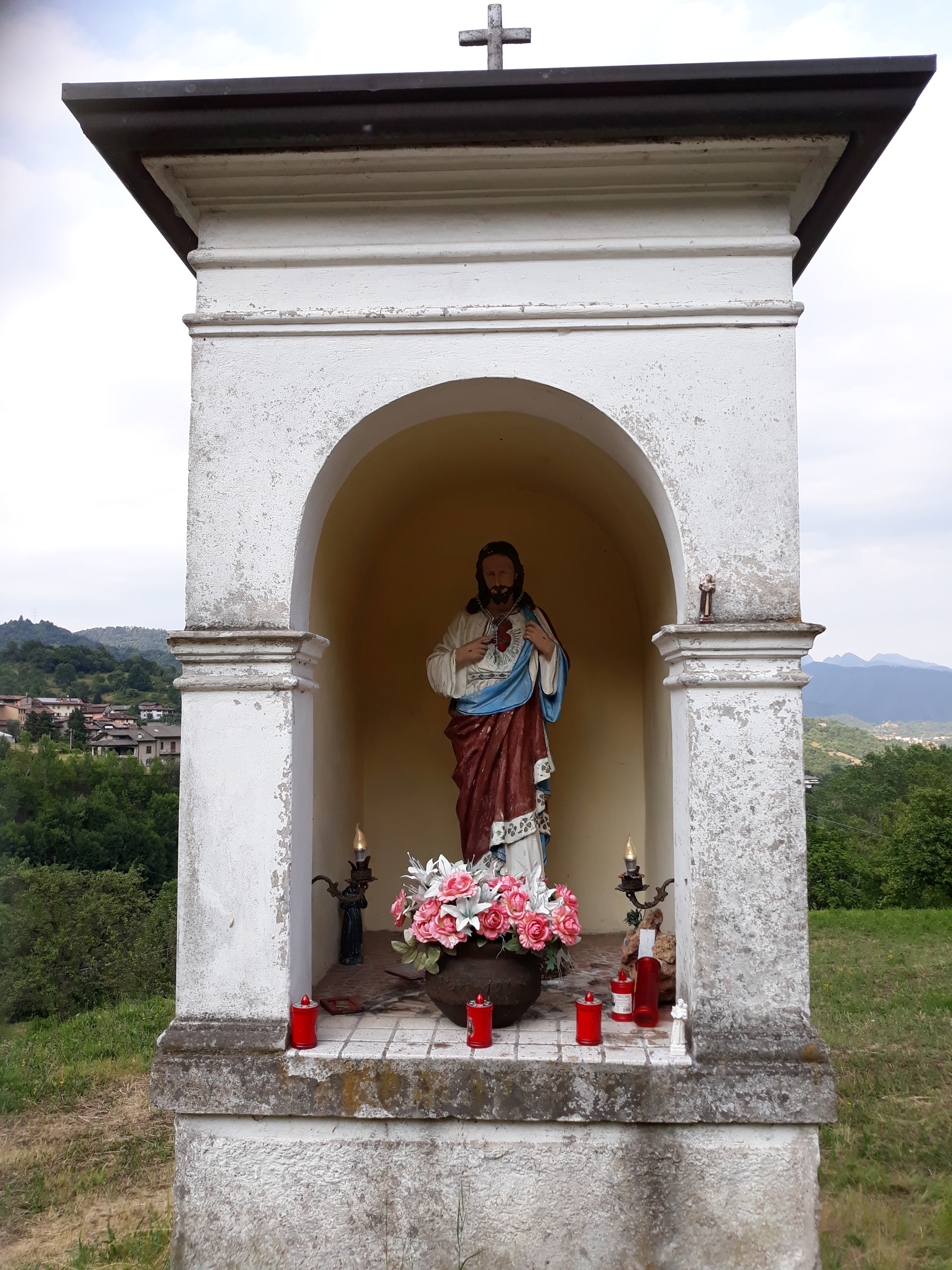 L’edicola, collocata su un poggio panoramico, presenta immagini sacre sui quattro lati. E’ dotata di un pannello fotovoltaico, collocato sul lato posteriore, non visibile ad una visione frontale, che alimenta i due lumini (rigorosamente a LED, anche se di foggia tradizionale) posti nella nicchia principale, quella rivolta verso la strada.