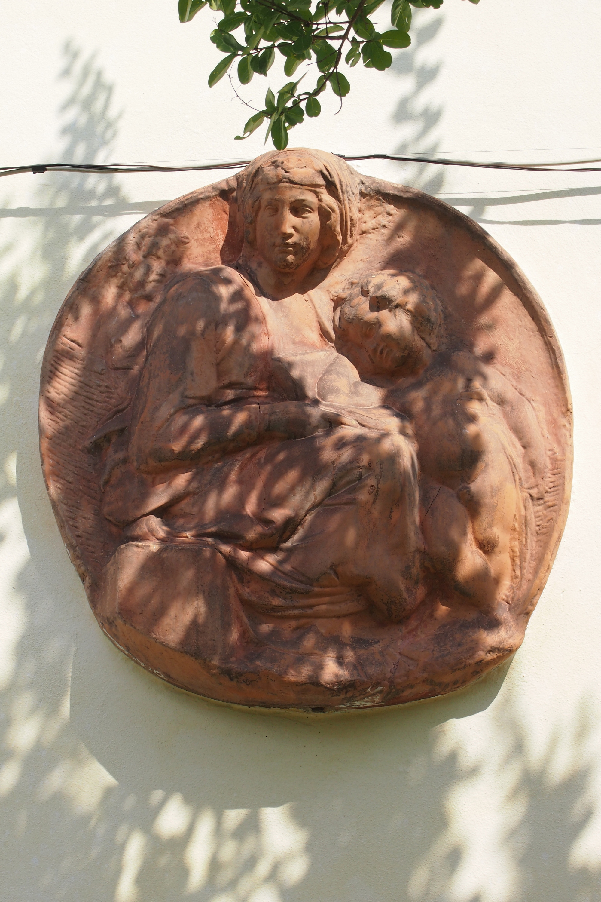Tondo in terracotta di una Madonna con Bambino, sul retro della chiesetta di San Biagio a Bigoncio, frazione di Inverigo. Il volto guarda verso la ferrovia.