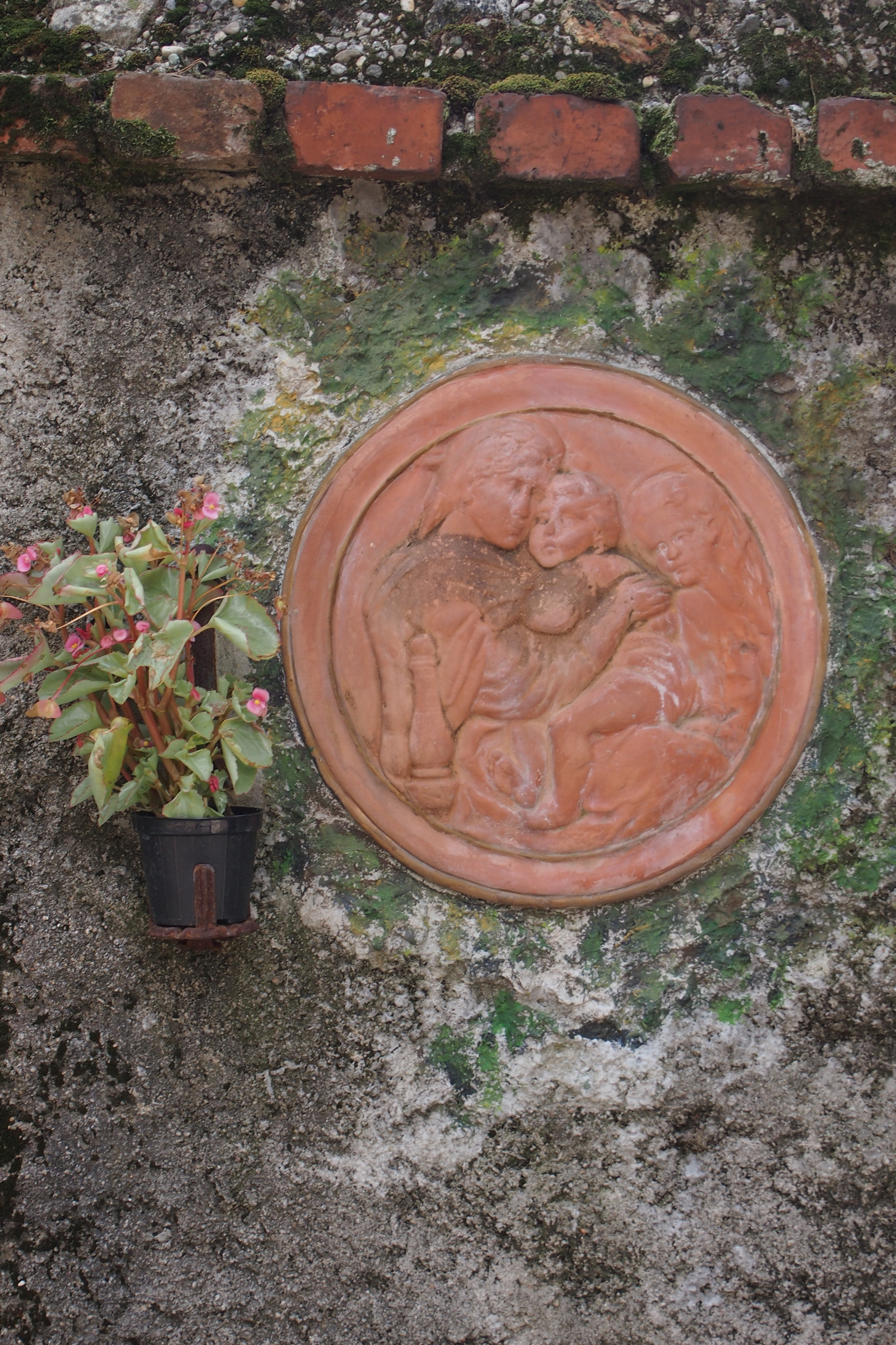Medaglione in terracotta sul muro di una casa sulla piazza della chiesa di Inverigo.