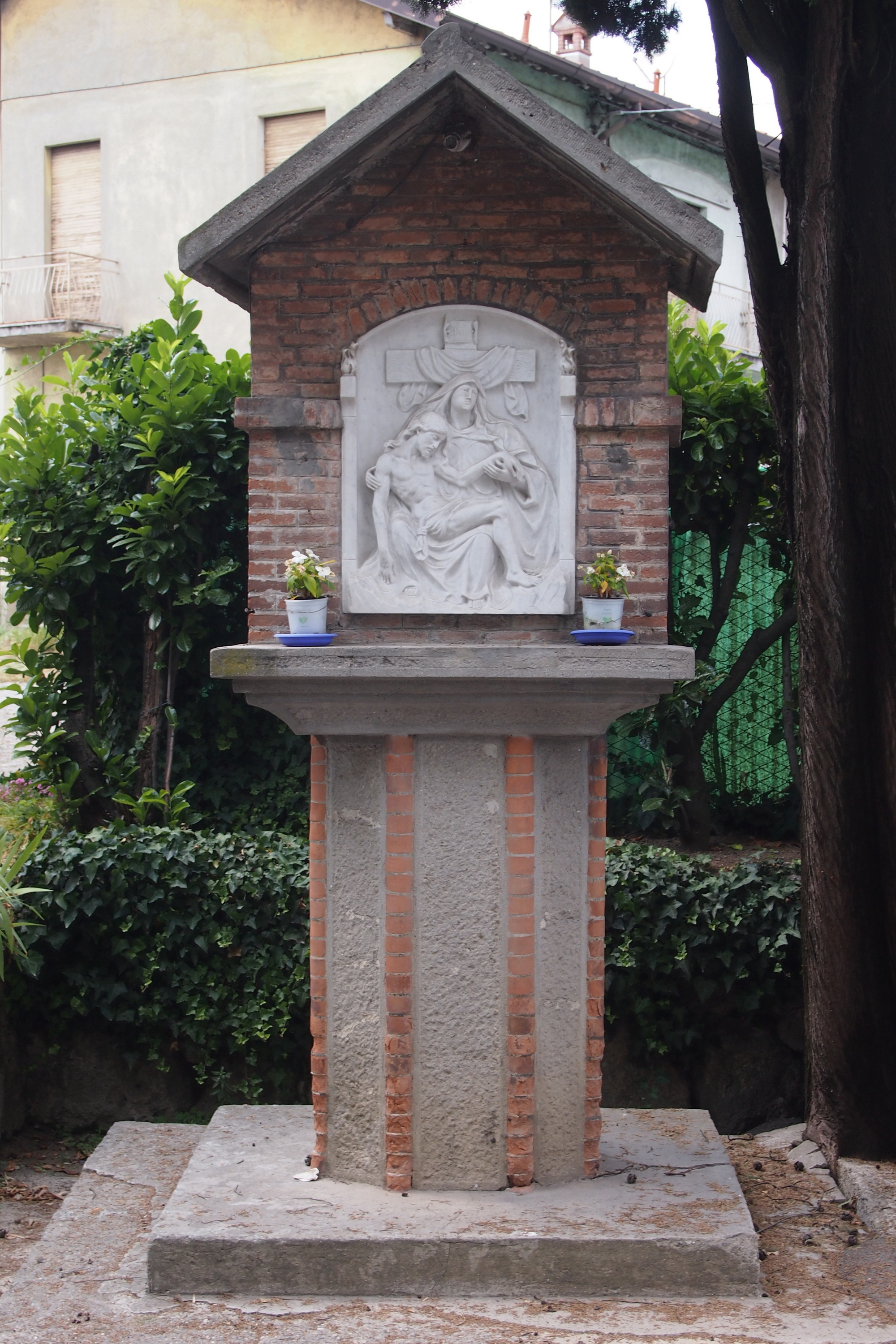 Pilastrello con una rappresentazione della Pietà, guarda verso il muro di cinta del parco di Villa Mezzanotte, nella frazione di Romanò Brianza del Comune di Inverigo.