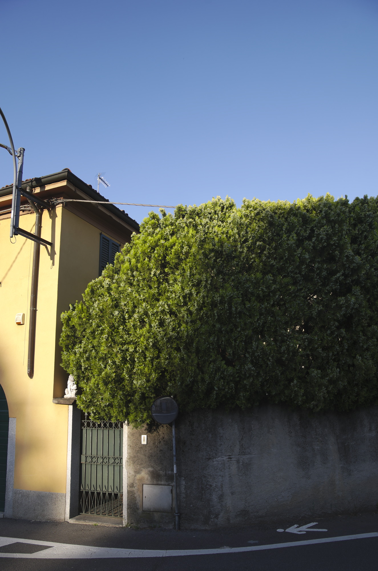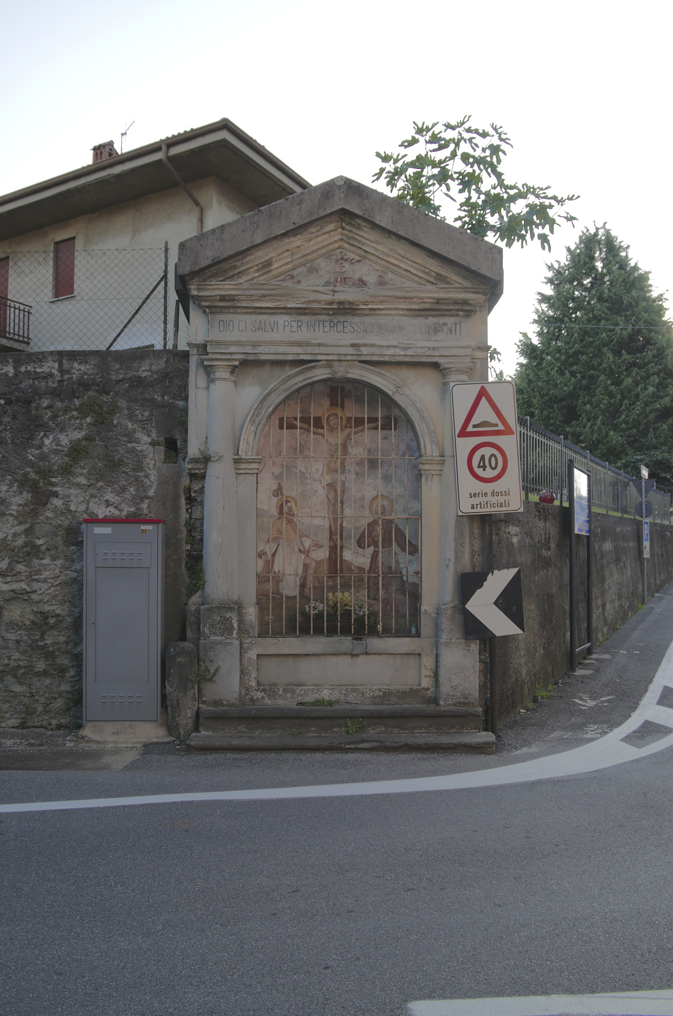 Edicola con affresco della Crocifissione con due santi ai piedi della croce (verosimilmente San Rocco a sinistra e Sant’Antonio o Santo Stefano a destra) - Annone di Brianza, via Sant’Antonio incrocio via Castello e via Cabella Lattuada.