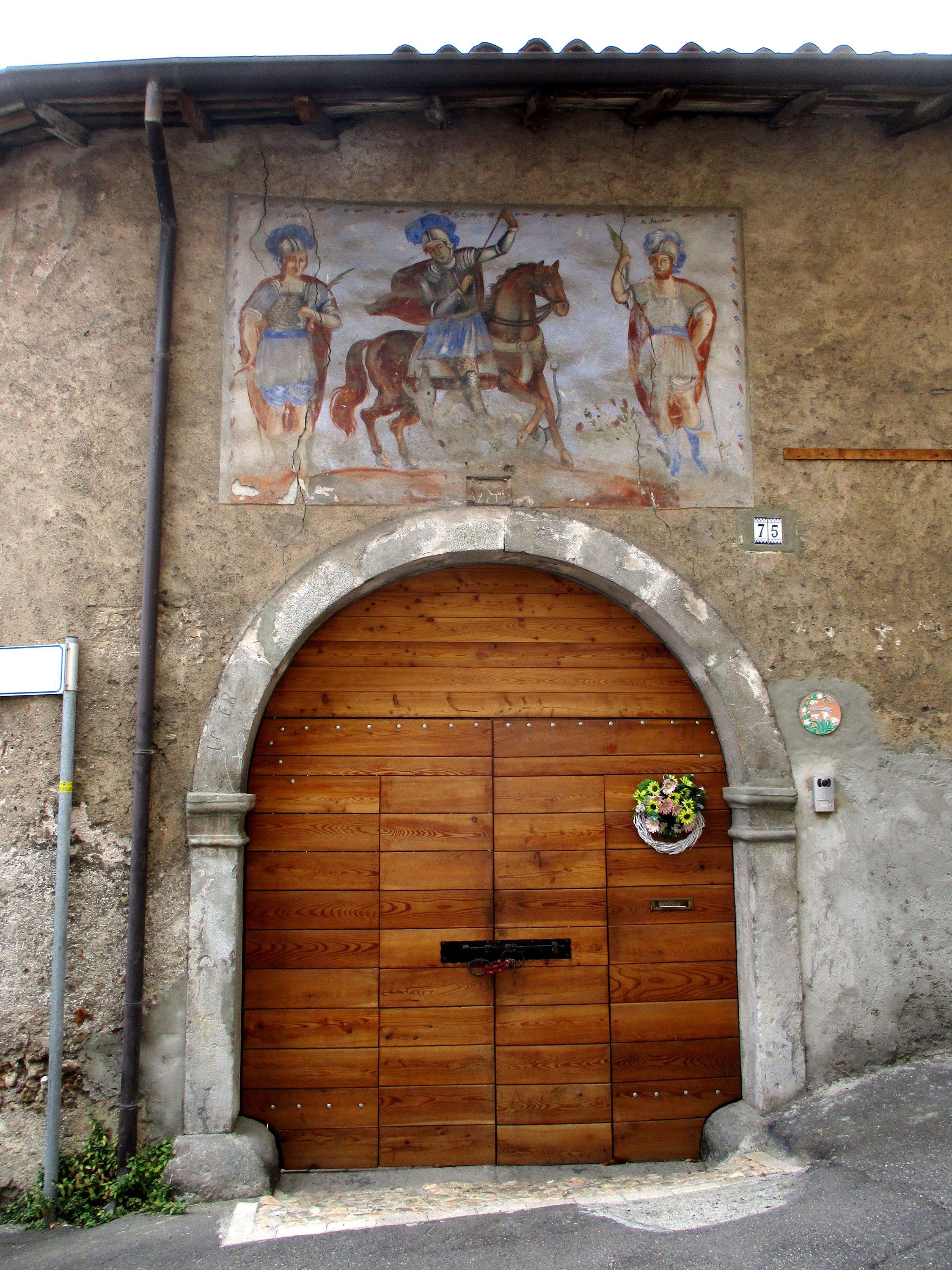 L’affresco, sopra il portone di accesso ad una corte, ritrae tre santi soldati. San Giorgio, a cavallo nell’atto di trafiggere con la lancia il drago, e S. Faustino e S. Giovita, patroni di Brescia, con la palma del martirio.